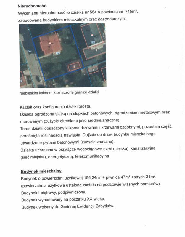 działka o pow. 715 mkw, budynek o pow. użytkowej 156,24 mkw, piwnica 47 mkw, strych 31 mkw. Parter: korytarz, cztery pokoje, kuchnia i łazienka. Piętro: korytarz, dwa pokoje, kuchnia i dwa pomieszczenia strychowe. Budynek gospodarczy o pow. użytkowej 40 mkw.