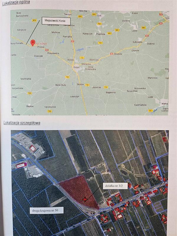 działka o pow. 2,27 ha, (22.700m.kw), położona bezpośrednio przy drodze krajowej nr 50 Grójec-Sochaczew. Przedmiotem licytacji będzie nieruchomość gruntowa położona w msc. Konie, gm. Pniewy, powiat grójecki, województwo mazowieckie, działka numer ew. 3/2, ( obręb 0018), o powierzchni 2,2700 ha, dla której Sąd Rejonowy w Grójcu V Wydział Ksiąg Wieczystych prowadzi księgę wieczystą nr RA1G/00071122/3. Działka w kształcie wielokąta podobnym do trójkąta o wymiarach boków: od strony wschodniej ok. 235 metrów, od strony południowo-zachodniej ok. 150 m., od strony zachodniej ok. 157 m., i od strony północno-zachodniej ok. 153 m. Sąsiedztwo to nieruchomości rolne, zabudowa mieszkalno- gospodarcza, zabudowa usługowa oraz stacja paliw. Działka nie jest zabudowana, nie jest zagospodarowana – jest użytkowana rolniczo – odłogowana od lat, porośnięta samosiewami brzozy i osiki. Działka z możliwym dostępem do sieci elektrycznej i gazowej. Teren działki jest płaski ze spadkiem w kierunku północno - zachodnim. Teren działki poniżej rzędnej drogi krajowej nr 50 tylko w miejscu urządzenia zjazdu zrównuje się z poziomem drogi. Obok zjazdu jest betonowy słup - wskaźnik wyznaczający pas drogowy oraz obok metalowy znak z rury w kolorze żółtym oznaczający linie gazową oraz filar bramownicy. Od bramownicy w kierunku północnym na działce jest widoczny drugi metalowy znacznik linii gazowej. Przy południowym narożu działki jest kolejny słup znacznikowy metalowy żółty linii gazowej. Przy drodze nr 50 w pasie drogowym jest posadowiona bramownica i obok jest stanowisko słupowe na szczudłach i są słupy drewniane dawnej linii telefonicznej. Według mapy zasadniczej wynika, że bramownica (filar i skrzynka energetyczna ZK) a także linia teletechniczna posadowione są w granicach działki nr 3/2. Północne naroże działki oraz działka od strony wschodniej posiada ogrodzenie międzysąsiedzkie. W dziale III księgi wieczystej został dokonany wpis o zakazie zbywania nieruchomości na podstawie postanowienia Sądu Okręgowego w Warszawie. Działka zgodnie z planem zagospodarowania przestrzennego Gminy Pniewy nr XXIX/208/02 znajduje się na terenach rolnych oraz terenach zabudowy produkcyjnej i działalności gospodarczych nieuciążliwych poza strefą terenów mieszkaniowych (oznaczonych symbolem P i R). Działka jest własnością spółki z ograniczoną odpowiedzialnością.