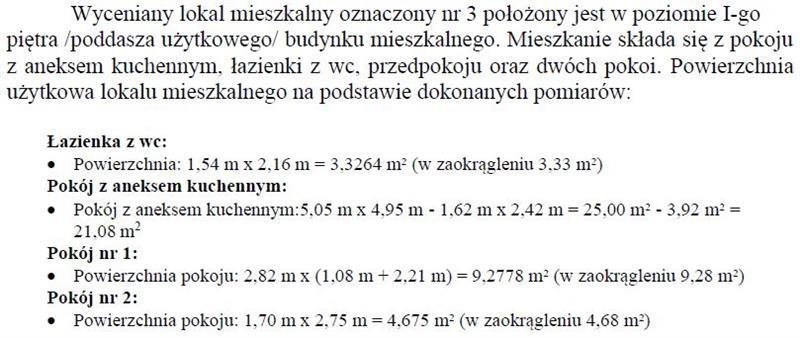 prawo własności do lokalu mieszkalnego nr 3 o powierzchni łącznej lokalu mieszkalnego wraz z pomieszczeniami przynależnymi 98,74 m2, położonego przy ul. Ignacego Domeyki 16 w miejscowości Jelenia Góra, gmina Jelenia Góra, powiat Jelenia Góra, województwo dolnośląskie. Lokal mieszkalny położony na drugiej kondygnacji /1 piętro/, składający się z pokoju z aneksem kuchennym, łazienki z wc, przedpokoju i dwóch pokoi. Zgodnie z zapisem, do lokalu mieszkalnego przynależy pomieszczenie gospodarcze oraz korytarz. Właściciel lokalu mieszkalnego, dla którego urządzono księgę wieczystą ma udział we wspólnych częściach budynku i w prawie współwłasności gruntu w udziale 3366/10000 części objętych księgą wieczystą JG1J/00001673/3. Nieruchomość lokalowa posiada urządzoną księgę wieczystą KW JG1J/00109332/8, prowadzoną przez Sąd Rejonowy w Jeleniej Górze – VI Wydział Ksiąg Wieczystych. Uwaga podczas wizji nieruchomości ujawniono rozbieżność, bowiem powierzchnia rzeczywista różni się od tej ujawnionej w KW.