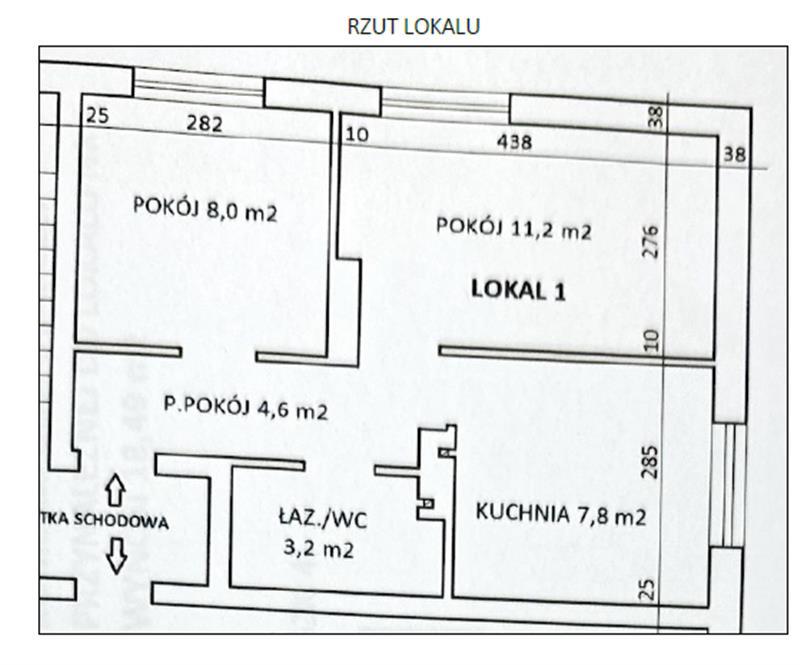 Lokal mieszkalny oznaczony jako nr 1 stanowiący odrębną nieruchomość wraz z udziałem w wysokości 19/1000 w prawie własności działki nr 11/1oraz takim samym udziałem w częściach wspólnych wszystkich budynków znajdujących się na powyższej nieruchomości. Lokal rozkładowy o powierzchni 34,80 m2, położony na parterze (I kondygnacji), składa się z dwóch pokoi, łazienki z wc oraz korytarza. Stolarka okienna PCV, stolarka drzwiowa drewniana starego typu. Ekspozycja okien na północ oraz zachód. Wykończenie lokalu z okresu budowy budynku, na podłodze wylewka betonowa z wykładziną PCV, ściany i sufity otynkowane oraz pomalowane farbą. W łazience zamontowana wanna oraz toaleta. Zamontowane zewnętrzne odbiorniki ciepła. Gospodarka remontowa prowadzona w sposób dostateczny, standard wykończenia lokalu niski. Materiały zastosowane do wykończenia pomieszczeń lokalu typowej jakości z lat 70-tych ubiegłego wieku, posiadające znaczne oznaki zużycia. Do lokalu przynależy komórka o powierzchni 18,49 m2, znajdująca się w budynku gospodarczym