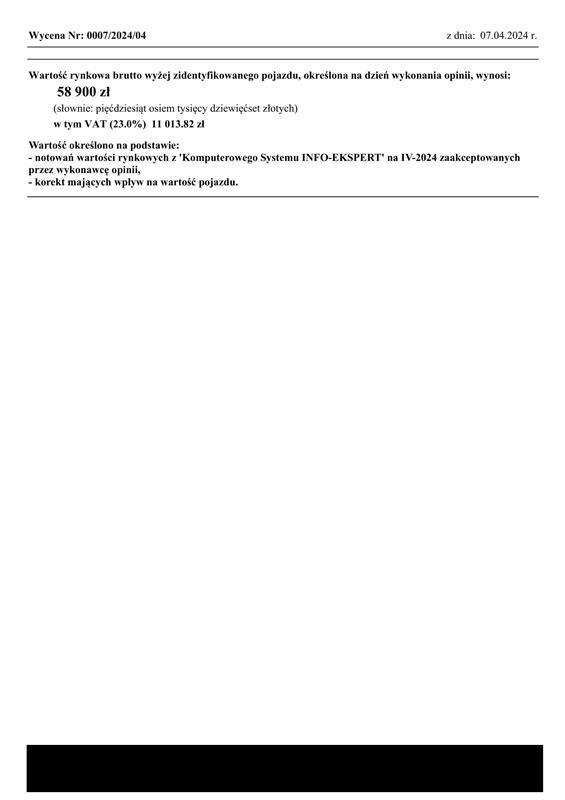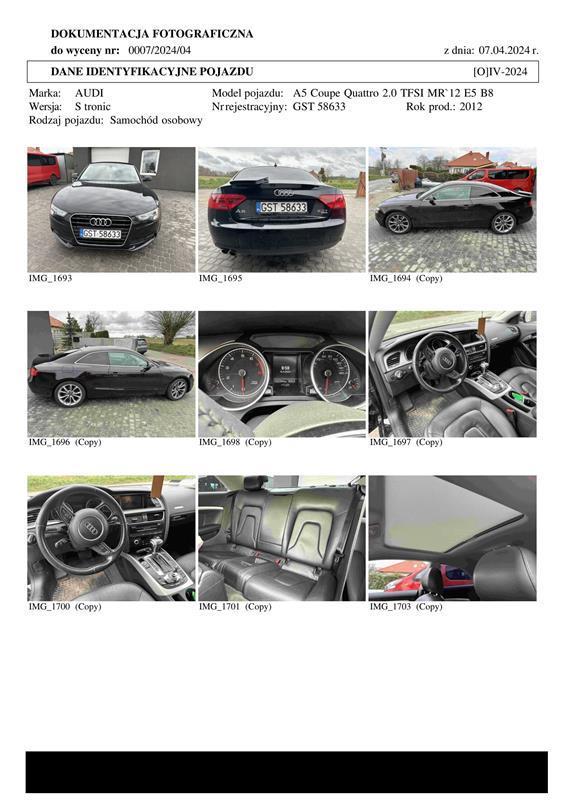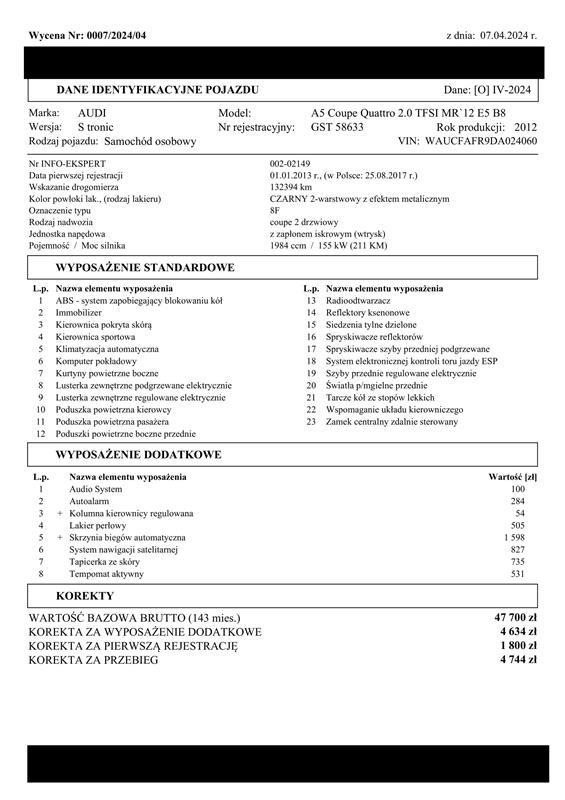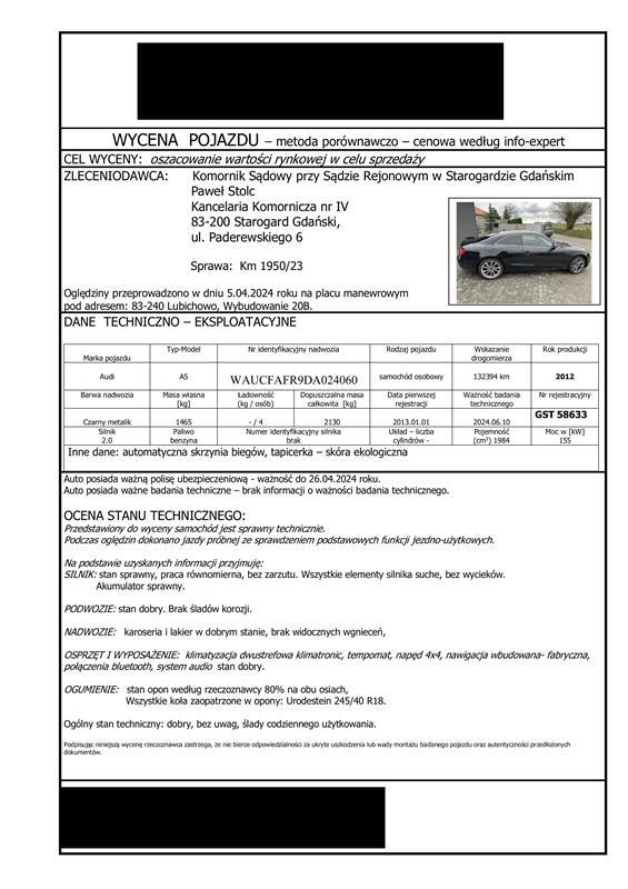 | 1 | samochód osobowy AUDI A5 2012 r., GST 58633 VIN WAUCFAFR9DA024060 | 1 | 58 900,00 zł 47886,18 zł netto + 23% VAT | 29 450,00 zł* | 1 473,00 zł |