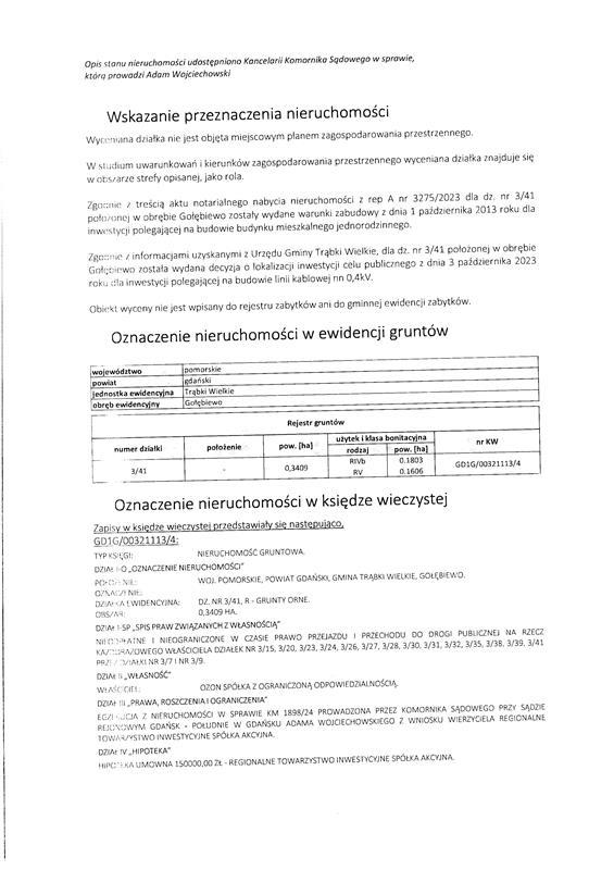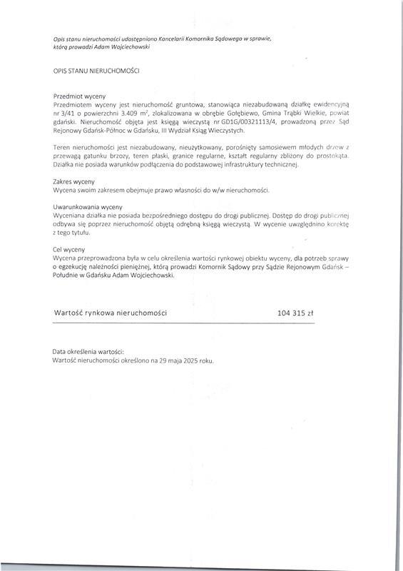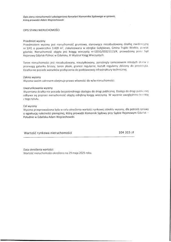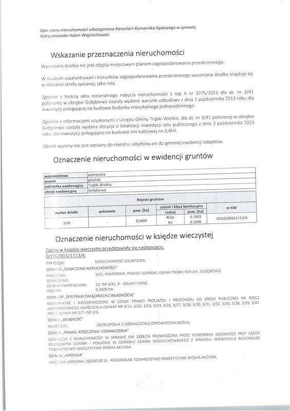 - nieruchomości położonej przy Gołębiewo,Gołębiewo, 83-033 Trąbki Wielkie, dla której Sąd Rejonowy Gdańsk - Północ w Gdańsku III Wydział Ksiąg Wieczystych (adres: ul. Żabi Kruk 14, Gdańsk, 80-822 Gdańsk) prowadzi księgę wieczystą o numerze GD1G/00321113/4.