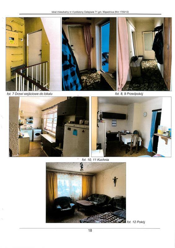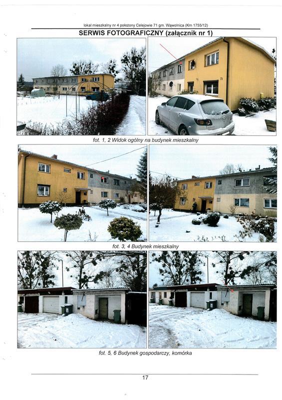 - lokal mieszkalny nr 4 położony w budynku wielorodzinnym nr 71 w miejscowości Celejów gm. Wąwolnica o powierzchni użytkowej 65,70 m.kw., posiadający księgę wieczystą w Wydziale Ksiąg Wieczystych Sądu Rejonowego w Puławach nr KW LU1P/00065487/5, mieszkalnie położone jest na I piętrze budynku wielorodzinnego i składa się z dwóch pokoi, kuchni z kotłownią, łazienki z wc oraz przedpokoju, stan techniczny lokalu jest przeciętny – do remontu, do lokalu przynależy piwnica oraz pomieszczenie komórki zlokalizowane w budynku gospodarczym murowanym, budynek wielorodzinny posiada dwie kondygnacje nadziemne i został wzniesiony w latach 60 – tych XX w.
