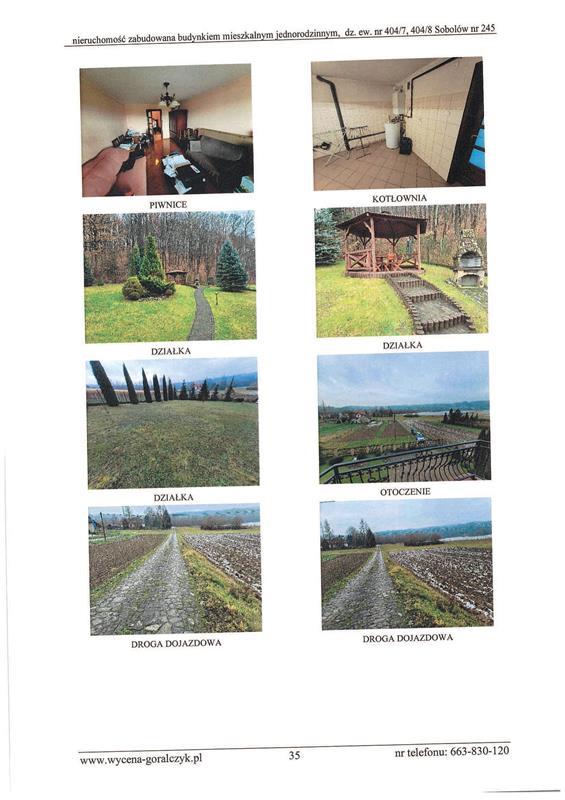 Działki ewidencyjne nr 404/7 i 404/8 o łącznej powierzchni 2000 m2 przylegają do siebie tworząc całość gospodarczą. W południowej części działki ewidencyjnej nr 404/7 znajduje się dom mieszkalny jednorodzinny. Pozostały obszar stanowi ogród przydomowy, ogrodzony, zagospodarowany zielenią, zadbany, przystrzyżony trawnik, liczne nasadzenia drzew i krzewów ozdobnych, w północno-wschodniej części działki nr 404/8 posadowiona altana ogrodowa oraz grill kamienny, dojazd, dojście do budynku, opaska wokół budynku oraz ścieżka prowadząca do altany utwardzone kostką betonową. Teren ogrodzony, brama wjazdowa z napędem. Teren o dość dużym nachyleniu, kształt działek regularny prostokątny. Do działki doprowadzone: woda, gaz, sieć elektroenergetyczna oraz telekomunikacyjna, na działce zbiornik szczelny na nieczystości ciekłe.
