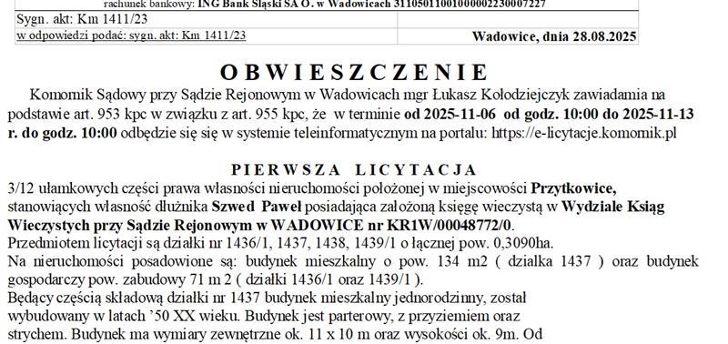 Komornik Sądowy przy Sądzie Rejonowym w Wadowicach mgr Łukasz Kołodziejczyk zawiadamia na podstawie art. 953 kpc w związku z art. 955 kpc, że w terminie od 2025-11-06 od godz. 10:00 do 2025-11-13 r. do godz. 10:00 odbędzie się się w systemie teleinformatycznym na portalu: https://e-licytacje.komornik.pl