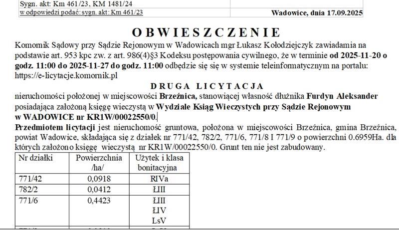 Komornik Sądowy przy Sądzie Rejonowym w Wadowicach mgr Łukasz Kołodziejczyk zawiadamia na podstawie art. 953 kpc zw. z art. 986(4)§3 Kodeksu postępowania cywilnego, że w terminie od 2025-11-20 o godz. 11:00 do 2025-11-27 do godz. 11:00 odbędzie się się w systemie teleinformatycznym na portalu: https://e-licytacje.komornik.pl