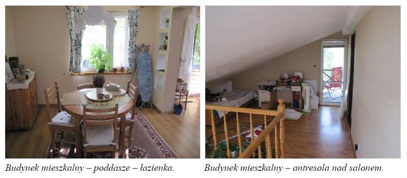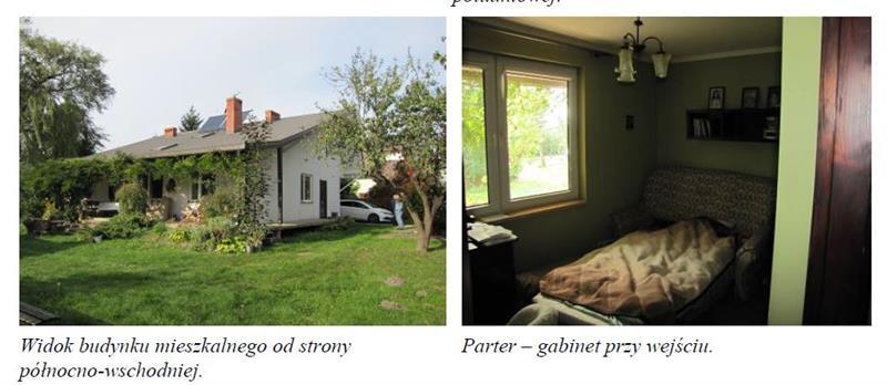 Działka 149/1 zabudowana budynkiem mieszkalnym parterowym z poddaszem użytkowym, murowanym budynkiem gospodarczym i drewnianą szopą. Budynek mieszkalny jednorodzinny według typowego projektu „W6/76". Realizowany w latach 1998-2000. Wolnostojący dom jednorodzinny, niepodpiwniczony z wbudowanym garażem. Na parterze od wejścia do budynku część reprezentacyjna: hol, sanitariat, gabinet oraz wejście do salonu. Obszerny salon z kominkiem w wyjściem na zadaszony taras od strony wschodniej. Nad salonem otwarta przestrzeń i antresola z trzema sypialniami na poddaszu. W głębi budynku kuchnia, jadalnia i pomieszczenie gospodarcze (pralnia, kotłownia, składzik). Nad budynkiem dach dwuspadowy asymetryczny z oknami połaciowymi Velux.