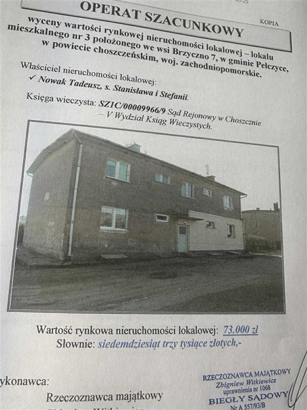 - lokalu mieszkalnego położonego przy Brzyczno 7/3,Brzyczno, 73-260 Pełczyce, dla którego Sąd Rejonowy w Choszcznie V Wydział Ksiąg Wieczystych (adres: ul. Wolności 14, Choszczno, 73-200 Choszczno) prowadzi księgę wieczystą o numerze SZ1C/0009966/9.