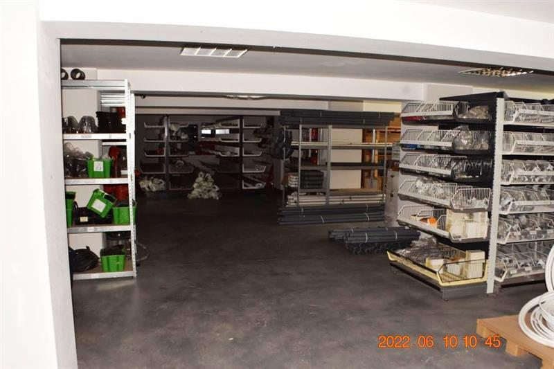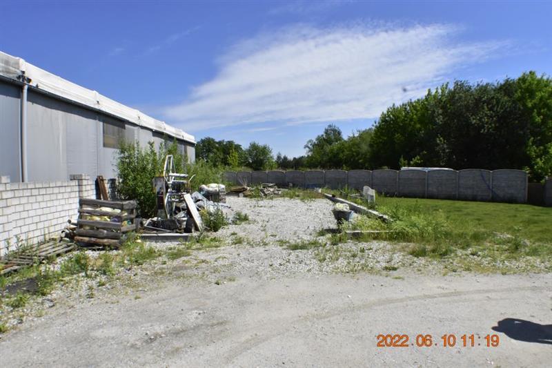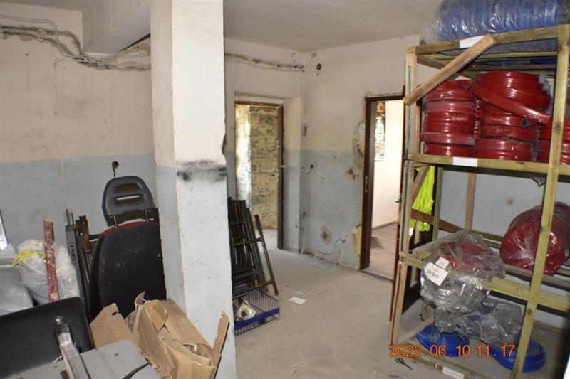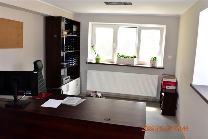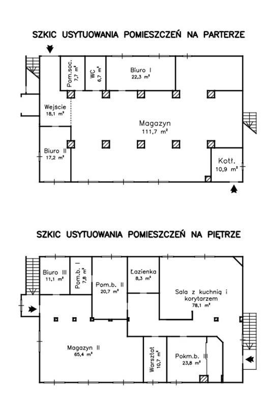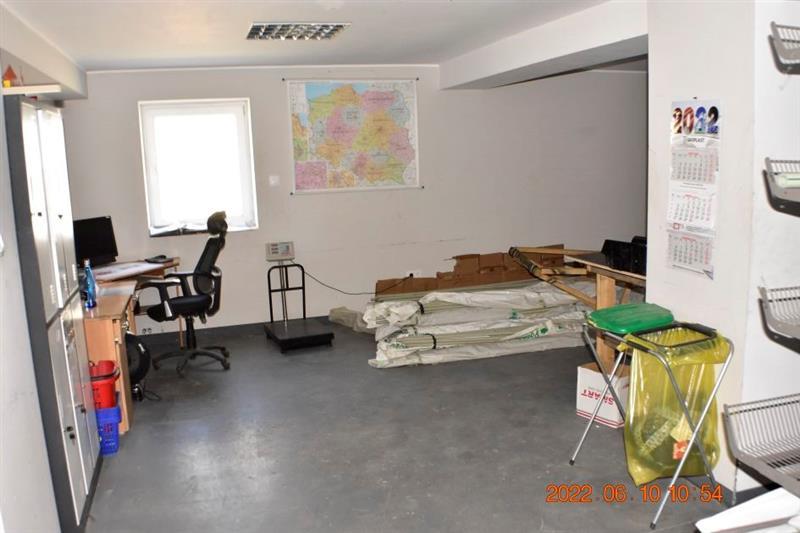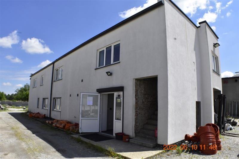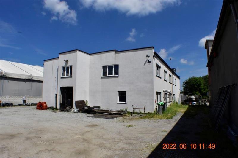 Budynek magazynowo-biurowy: obiekt wolnostojący, niepodpiwniczony, dwukondygnacyjny i przykryty płaskim dachem. Pow. zabud. 288m2, pow. całkowita 576m2, pow. użytk. 402,5m2,wys. pom. 2,36-2,47m. Budynek posiada cztery wejścia: dwa na parter oraz dwa na piętro. Struktura budynku : parter: wejście 18,1m2, magazyn 111,7m2, pom. socj. 7,7m2, wc 6,7m2, biuro I 22,3m2, kotłownia 10,9m2, biuro II 17,2m2 - razem 194,6m2; piętro: biuro III 11,1m2, magazyn II 65,4m2, pom. biurowe I 7,8m2, pom.biurowe II 20,7m2, łazienka 8,3m2, warsztat 10,7m2, pom. biurowe III 23,8m2, sala + kuchnia + korytarz 78,1m2 - razem 225,9m2 Budynek wybudowany około 50 lat temu w technologii tradycyjnej, ściany murowane z cegły i pustaków żużlobetonowych, stropy żelbetowe monolityczne, dach płaski dwuspadowy pokryty papą na lepiku, stolarka - PCV z szybą zespoloną; drzwi drewniane. Budynek wyposażony w instalację wodociągową, kanalizacyjną, elektryczną, wentylacji grawitacyjnej; ogrzewanie - indywidualne: centralne zasilanie z kotła na opał stały.