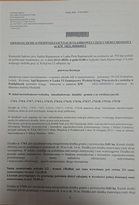 Komornik Sądowy przy Sądzie Rejonowym w Łasku Piotr Staniszewski Kancelaria Komornicza nr IV w Łasku na podstawie art. 953 ustawy z dnia 17 listopada 1964 r. Kodeks postępowania cywilnego (dalej: kpc) podaje do publicznej wiadomości, że w sprawie Gkm 33/22 i inne w dniu 14-11-2025 o godz. 12:00 w budynku Sądu Rejonowego w Łasku z siedzibą przy Kolejowa 12, 98-100 Łask, odbędzie się pierwsza licytacja:
