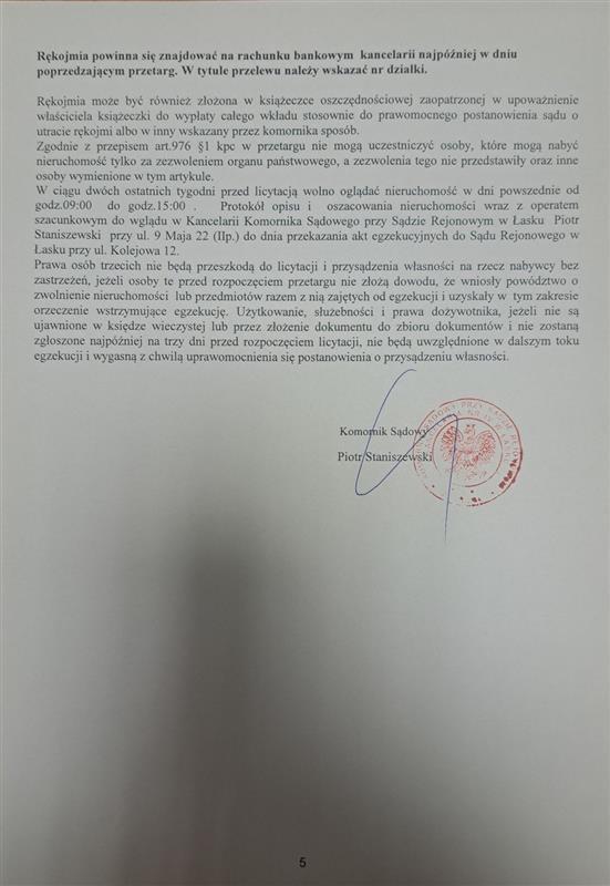 W ciągu dwóch tygodni przed licytacją wolno oglądać wyżej wymienioną nieruchomość w dni powszednie od godz. 09:00 do godz. 15:00. Protokół opisu i oszacowania można przeglądać w siedzibie Sądu Rejonowego w Łasku ul. Kolejowa12, 98-100 Łask.