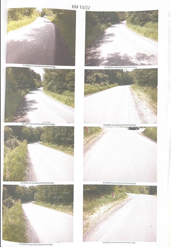 a z pozostałych dwóch stron grunty stanowiące ciąg dalszy tej drogi. W pobliżu brak terenów zabudowanych obiektami kubaturowymi. Nieruchomość oprócz pasa utwardzonego asfaltem obejmuje również część pobocza tej jezdni na którą składa się grunt utwardzony kruszywem, zarośnięty trawą, a nawet wzdłuż północnej granicy zadrzewieniamii zakrzewieniami samosiejnymi nieurządzonymi. Droga obejmuje również umocnione pobocze wykonane z kruszywa naturalnego. Część północną nieruchomości wzdłuż drogi przecina sieć wodociągowa z zamocowanym na jej terenie hydrantem. Orientacyjne wymiary działki sprowadzone do kształtu prostokąta wynoszą: ok. 78,00 x 9,20m.