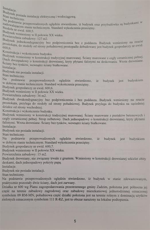 Działka nr 600 jest zabudowaną i częściowo ogrodzoną działką o powierzchni 1,20 ha. Działka jest działką rolną z zabudową siedliskową w jej północnym krańcu. Zabudowę siedliskową na działce stanowi budynek mieszkalny nr ewid. 600;1 wraz z dobudowanym garażem nr ewid. 600;2, budynek obory nr ewid. 600;4 wraz z dobudowaną przybudówką nr ewid. 600;3, budynkiem stodoły nr ewid. 600;5 z przylegającym do niej budynkiem gospodarczym nr ewid. 600;6 i zdewastowanym drewnianym budynkiem gospodarczym nr ewid. 600;7. Kształt działki zbliżony jest do wydłużonego równoległoboku z nieregularną granicą południową, którą stanowi ciek wodny – Pichna Szadowicka. Wymiary działki to: średnia szerokość ok. 47 m, średnia długość ok. 260 m. Teren działki płaski. Działka usytuowana w sąsiedztwie drogi wojewódzkiej nr 479 Zadzim – Rossoszyca, równolegle do niej. Działka posiada dostęp do drogi publicznej od strony północnej – droga o nawierzchni utwardzonej. Wzdłuż północnej granicy działki przebiega napowietrzna sieć energii elektrycznej. Działka posiada przyłącze do sieci energii elektrycznej, sieci wodociągowej i sieci telekomunikacyjnej.