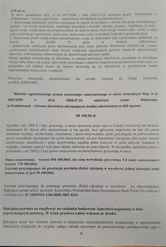 2. dożywotnie prawo użytkowania nieruchomości z tym, że wykonanie tego użytkowania ograniczać się będzie do działki 50 arów w miejscu jednorazowo i dobrowolnie wybranym przez uprawnionych przy czym zarówno służebność osobista jak i prawo użytkowania nieruchomości będą służyły wyłącznie zaspokajaniu potrzeb własnych uprawnionych, darczyńcy zobowiązują obdarowanego do sprawowania nad nimi opieki. Strony zgodnie oświadczają, że darczyńcy w ramach powyższej służebności przyjmują na mieszkanie swoją córkę wraz z jej synem, jako osoby pozostające z nimi we wspólnym gospodarstwie domowym, a w przypadku ich śmierci strony tej umowy umawiają się, że służebność ta przysługiwać będzie wspomnianym wyżej córce i wnukowi. Powyższe obciążenia nieruchomości nie zostały wpisane do księgi wieczystej nr SR2L/00030148/3. Wartość ograniczonego prawa rzeczowego ustanowionego w akcie notarialnym Rep. A nr 3457/2006 z dnia 2006.07.24 spisanym przez Notariusza w Poddębicach – Umowa darowizny obciążającym działkę zabudowaną nr 600 wynosi: 99 100,00 zł. Zgodnie z art. 1000 § 3 kpc pozostają w mocy ujawnione przez wpis w księdze wieczystej lub złożenie dokumentu do zbioru albo nieujawnione w ten sposób, lecz zgłoszone najpóźniej na trzy dni przed terminem licytacji, użytkowanie, służebności i prawa dożywotnika, jeżeli przysługuje im pierwszeństwo przed wszystkimi hipotekami lub jeżeli nieruchomość nie jest hipotekami obciążona albo jeżeli wartość użytkowania, służebności i praw dożywotnika znajduje pełne pokrycie w cenie nabycia. Jednakże w wypadku ostatnim wartość tych praw będzie zaliczona na cenę nabycia. W przypadku spełnienia jednej z przesłanek z art 1000 § 3 kpc prawa ustanowione na nieruchomości pozostaną w mocy.