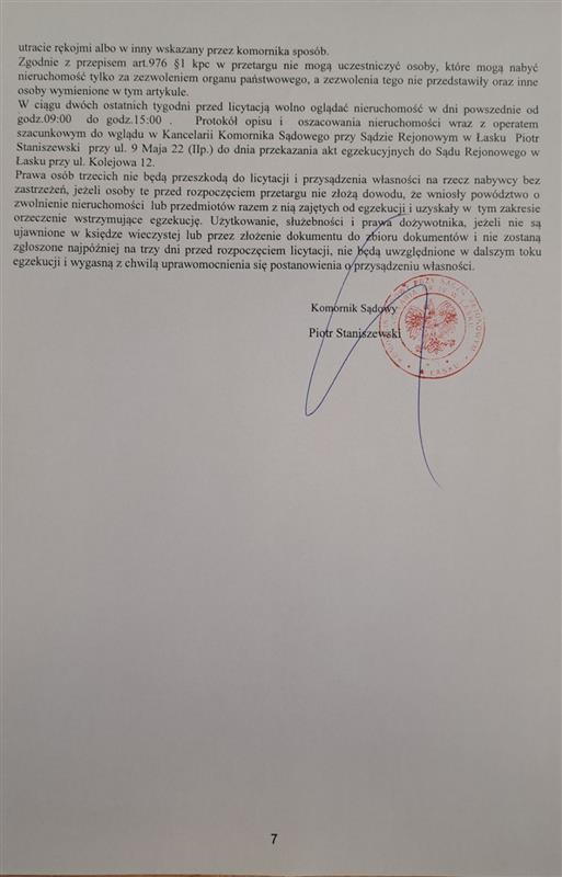 W ciągu dwóch tygodni przed licytacją wolno oglądać wyżej wymienioną nieruchomość w dni powszednie od godz. 09:00 do godz. 15:00. Protokół opisu i oszacowania można przeglądać w siedzibie Sądu Rejonowego w Łasku ul. Kolejowa12, 98-100 Łask.