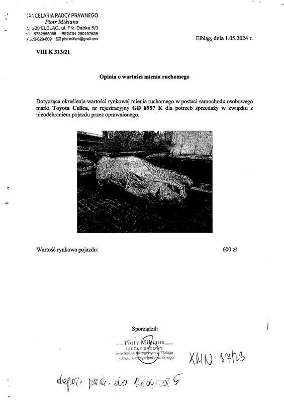 1 | Toyota Celica r. prod. 1994, GD 8957K powypadkowy, zniszczony | 1 | 600,00 zł | 450,00 zł | 23,00 zł | Elbląg, ul. Radomska, 23c, 82-300, Elbląg. W dniu 24.10.2025 w godzinach od 10:00 do 11:00 |
