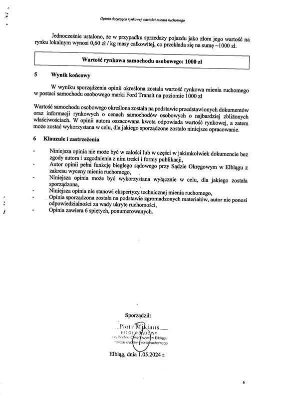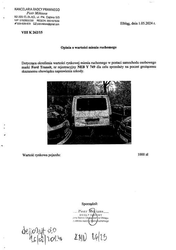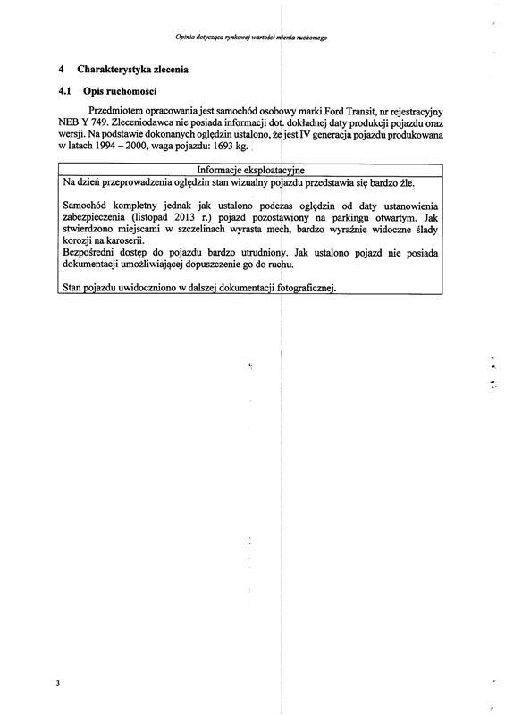 1 | Ford Transit nr rej. NEBY749 | 1 | 1 000,00 zł | 750,00 zł | 38,00 zł | Elbląg, ul. Radomska, 23c, 82-300, Elbląg. W dniu 24.10.2025 w godzinach od 10:00 do 11:00 |