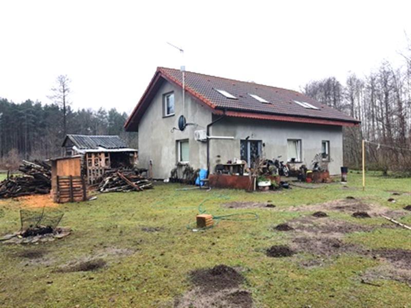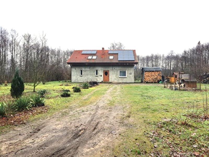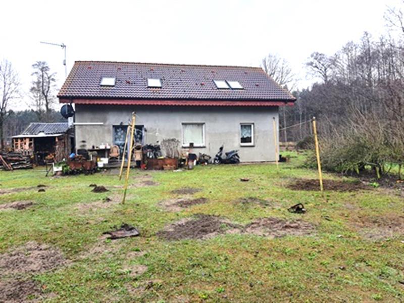 Przedmiotem licytacji jest nieruchomość gruntowa, o powierzchni 10000 m2. Grunt zabudowany jest domem mieszkalnym w zabudowie wolnostojącej, o powierzchni użytkowej 124,40 m2, parterowym z poddaszem użytkowym, niepodpiwniczonym. Grunt uzbrojony jest w sieć elektryczną i wodociągową. Kanalizacja lokalna – przydomowa oczyszczalnia ścieków. Teren nieruchomości jest częściowo ogrodzony. Brak ogrodzenia od frontu. Dojazd do działki odbywa się drogą gruntową. Budynek mieszkalny, wolnostojący, parterowy z poddaszem użytkowym, niepodpiwniczony. Budynek wzniesiono w technologii tradycyjnej, murowanej. Dach konstrukcji drewnianej, kryty dachówką cementową. Elewacje budynku ocieplone styropianem, bez warstwy elewacyjnej.