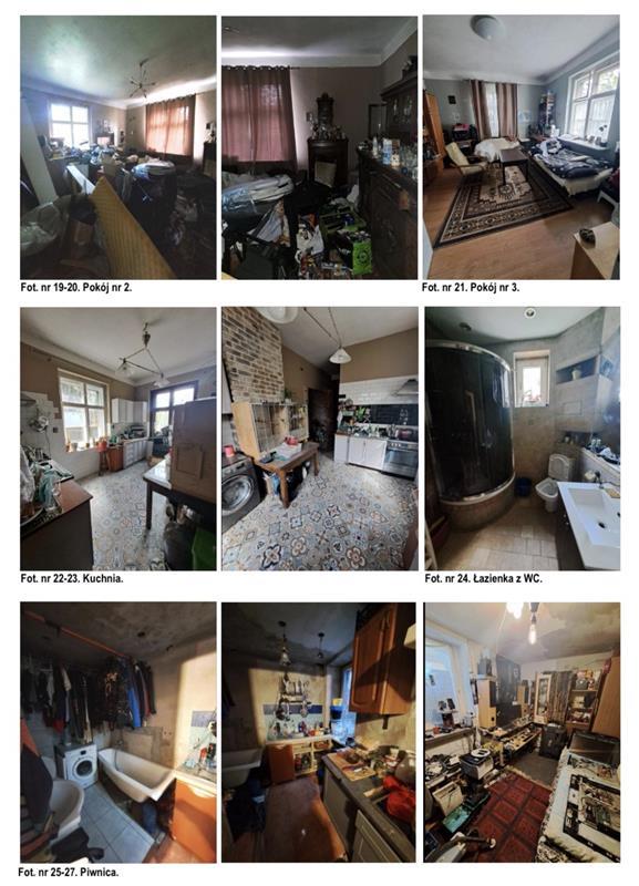 Przedmiotowy lokal mieszkalny zajmuje pierwszą kondygnację (podwyższony parter) budynku- lokal posiada oddzielne wejście i składa się z trzech pokoi (pokoje rozkładowe), kuchni, łazienki z WC oraz przedpokoju o łącznej powierzchni użytkowej równej 86,09 m2. Dodatkowo do lokalu przynależą cztery pomieszczenia w piwnicy o łącznej powierzchni 32,08 m2 oraz pomieszczenia poddasza (zaadaptowane na niewielkie mieszkanie) o łącznej powierzchni 15,38 m2.