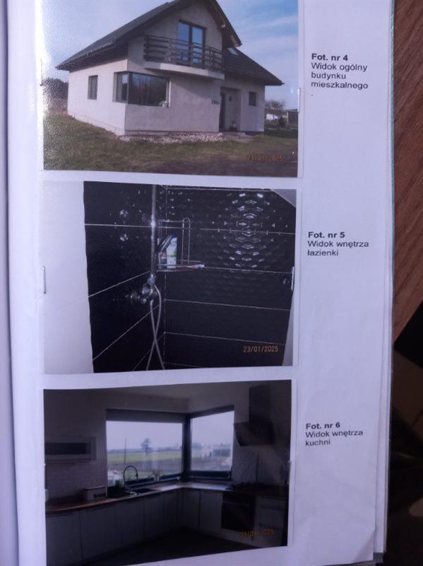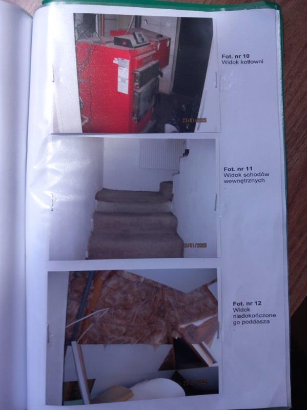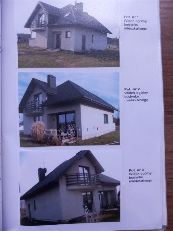 Zabudowę działki stanowi budynek mieszkalny, jednorodzinny, parterowy, wolnostojący. Budynek nie posiada podpiwniczenia. Budynek posiada powierzchnię zabudowy 107,91 m2, powierzchnię użytkową 147,68 m2 (parter 75,93 m2 oraz poddasze użytkowe 71,75 m2), kubaturę 758 m3. Parter składa się z wiatrołapu, korytarza, kuchni, łazienki, pokoju, salonu z jadalnią i kominkiem oraz kotłowni węglowej. Poddasze składa się z korytarza, trzech pokoi, łazienki. Budynek posiada fundamenty żelbetowe, ściany fundamentowe z bloczków betonowych, ściany zewnętrzne z pustaków ceramicznych, docieplone styropianem 15cm. Ściany wewnętrzne z cegły ceramicznej pełnej, pustaków ceramicznych i bloczków gazobetonowych. Strop międzykondygnacyjny jest monolityczny, żelbetowy, wykonany na mokro. Schody na poddasze są żelbetowe. Dach budynku jest wielospadowy płatwiowo-krokwiowy, pokryty blachodachówką. Schody zewnętrzne i taras są betonowe. Rynny i rury spustowe PCV, kominy murowane Leier. Tynki wewnętrzne ścian są cementowo-wapienne i gładzie, pomalowane. Tynki sufitów są maszynowe (korytarz parteru bez otynkowania), na poddaszu sufity z płyty gipsowo-kartonowej, pomalowane. Podłogi z płytek ceramicznych (kuchnia i wiatrołap) oraz z paneli podłogowych. Stolarka okienna PCV, drzwi drewniane. Instalacja elektryczna, wodna, kanalizacja sanitarna. Centralne ogrzewanie z własnej kotłowni węglowej, grzejniki panelowe. Nieruchomość można