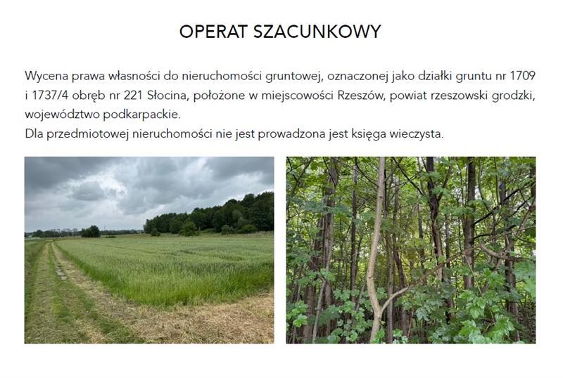 Przedmiotem licytacji jest prawo własności do nieruchomości gruntowej, oznaczonej jako działki gruntu nr 1709 i 1737/4 obręb nr 221 Słocina, położone w miejscowości Rzeszów, powiat rzeszowski grodzki, województwo podkarpackie - w udziale należącym do dłużnika Grzegorza Wnuka w 1/8 części. Dla przedmiotowej nieruchomości nie jest prowadzona jest księga wieczysta. Działka gruntowa opisana jako działka gruntu nr 1709 nie jest zabudowana. Powierzchnia działki wynosi 3.095,00 m2 (obręb ewidencyjny nr 221 Słocina). Kształt regularny, zbliżony do prostokąta. Działka o nachyleniu w kierunku północnym, działka z zasiewem pszenicy. Południową granicą przylega do drogi publicznej, wzdłuż zachodniej granicy urządzono drogę polną. Otoczenie działki stanowią tereny rolnicze i leśne. Dane na temat działki: • uzbrojenie działki: brak, • dojazd do działki - dobry, droga publiczna utwardzona częściowo kruszywem, • warunki terenowe zadowalające, teren o niewielkim nachyleniu w kierunku północnym z miejscowymi nierównościami, • warunki lokalizacyjne peryferyjne, • usytuowanie nieruchomości w stosunku do centrum miejscowości - peryferyjne. Działka gruntowa opisana jako działka gruntu nr 1737/4 nie jest zabudowana. Powierzchnia działki wynosi 1.354,00 m2 (obręb ewidencyjny nr 221 Słocina). Kształt regularny czworoboczny, zbliżony do prostokąta (szczegóły przedstawia mapa załączona do operatu). Działka o nachyleniu w kierunku północnym, porośnięta drzewostanem mieszanym. Otoczenie działki stanowią tereny leśne. Dane na temat działki: • uzbrojenie działki: brak, • dojazd do działki - brak, • warunki terenowe przeciętne, teren pochyły z miejscowymi nierównościami, • warunki lokalizacyjne peryferyjne, • usytuowanie nieruchomości w stosunku do centrum miejscowości - peryferyjne. Na dzień dzisiejszy obszar, na którym znajduje się nieruchomość gruntowa, jest objęty ustaleniami Studium uwarunkowań i kierunków zagospodarowania przestrzennego miasta Rzeszowa uchwalonym Uchwałą Nr LXXXV/1890/2023 Rady Miasta Rzeszowa z dnia 26 września 2023 r. w sprawie uchwalenia Studium uwarunkowań i kierunków zagospodarowania przestrzennego miasta Rzeszowa. Zgodnie z ustaleniami ww. uchwały wyceniana nieruchomość położona jest w konturze oznaczonym symbolem: - działka nr 1709 - C.EM – obszary ekologiczne z możliwością lokalizacji ekstensywnej zabudowy mieszkaniowej jednorodzinnej i zabudowy zagrodowej, strefa urbanistyczna miasta C; - działka nr 1737/4 - C.ZL – obszary lasów i zadrzewień.