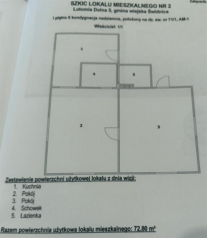 Lokal mieszkalny składający się z dwóch pokoi, kuchni, łazienki oraz ze schowka o powierzchni użytkowej 72,80 mkw oraz pomieszczenia przynależne: 3 komórki gospodarcze na parterze o powierzchni użytkowej 34,50 mkw oraz komórka gospdarcza na strychu o powierzchni użytkowej 7,90 mkw. łączna powierzchnia użytkowa lokalu wraz z powierzchnią pomieszczeń przynależnych wynosi 115,20 mkw wraz z udziałem 1666/10000 w prawie własności działki gruntu oraz części wspólnych budynku objętej księgą (SW1S/00001094/8). Lokal położony jest pod adresem: 58-113 Lutomia Dolna 5/2, dla którego V Wydział Ksiąg Wieczystych przy Sądzie Rejonowym w Świdnicy prowadzi księgę wieczystą o numerze KW SW1S/00077421/3.