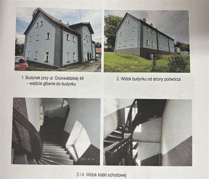 Budynek o stromym dachu i dwóch wejściach, o pow. użytkowej 538,62 m2 (9 lokali mieszkalnych), wykonany w technologii tradycyjnej przed 1945 r. Części wspólne budynku nr 46 zostały odnowione w ramach projektu "Odnowa części wspólnych wielorodzinnego budynku mieszkalnego przy ul. Grunwaldzkiej 46 w Głuszycy", projekt dofinansowany przez Europejski Fundusz Rozwoju Regionalnego. Budynek zadbany i wyposażony we wszystkie instalacje niezbędne dla funkcji mieszkalnej: wodno - kanalizacyjne, gaz sieciowy, instalację elektryczną. Ogrzewanie indywidualne.