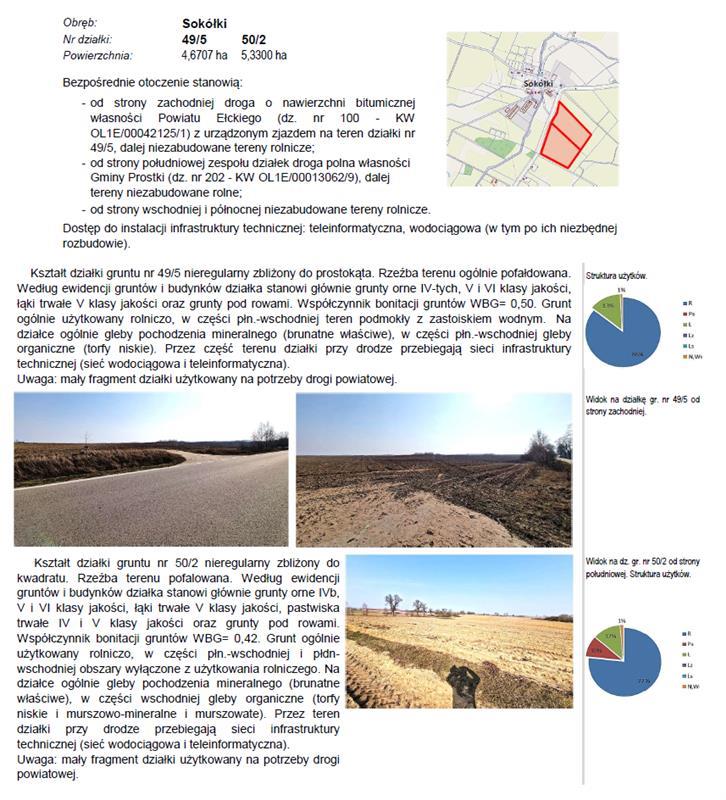 Przedmiotem licytacji jest nieruchomość gruntowa niezabudowana, położona w woj. warmińsko-mazurskim, powiecie ełckim, na terenie gminy Prostki, obrębie Sokółki, dla której Sąd Rejonowy w Ełku V Wydział Ksiąg Wieczystych prowadzi księgę wieczystą o numerze KW OL1E/00039515/8, w zakresie prawa własności działki gruntu nr 8/2 o pow. 1,5206ha, działki gruntu nr 41/1 o pow. 0,2400ha, działki gruntu nr 49/5 o pow. 4,6707ha oraz działki gruntu nr 50/2 o pow. 5,3300ha.