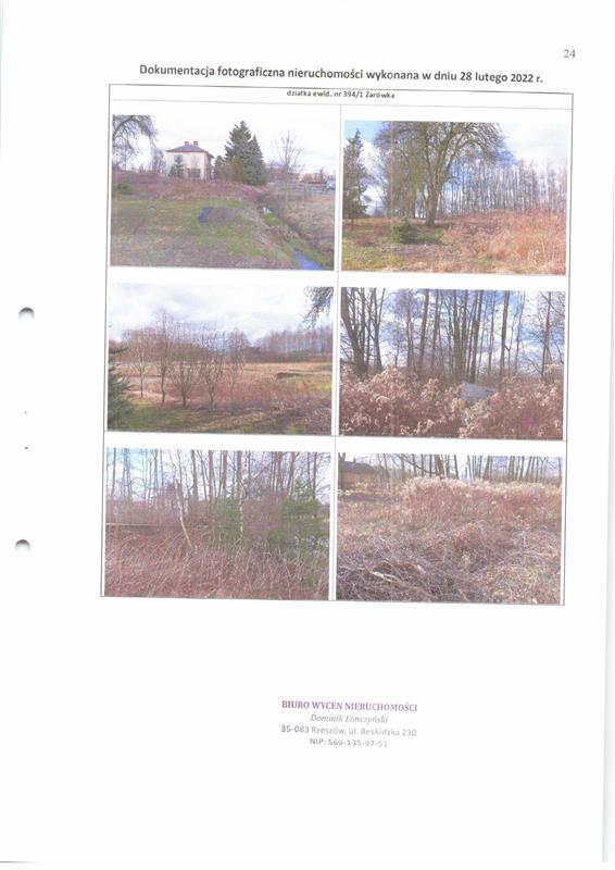 Przedmiotem licytacji jest udział 1/2 w nieruchomości rolnej położonej w miejscowości Żarówka, gmin. Radomyśl Wielki o nr działki 394/1 o powierzchni 0,0900 ha, dla której Sąd Rejonowy w Mielcu V Wydział Ksiąg Wieczystych prowadzi KW nr TB1M/00059413/1. Działka ewid. nr 394/1 o powierzchni 0,0900 ha położona jest około 50 m od lokalnej utwardzonej drogi i znajduje się wśród terenów zabudowy mieszkalnej jednorodzinnej i zagrodowej. Dojazdu do działki brak, ze względu na jej usytuowanie tuż nad lokalnym ciekiem wodnym. Działka przedmiotowa jest częściowo zakrzaczona i zadrzewiona samosiejkami drzew liściastych bez wartości tartacznej – olsza szara, brzoza, grusza i wierzba iwa. Przez teren działki przechodzą media w postaci sieci kanalizacji sanitarnej ks200 ze studzienkami typu betonowego (2 szt.), sieci gazowej gsD25 oraz sieci wodnej woD40. Działka posiada kształt foremny, wydłużony zbliżony do prostokąta o wymiarach szer. 20,0 m i długość 50,0 m. Teren działki nie jest równy, ze spadkiem (deniwelacja terenu ponad 1,0 m) w kierunku wschodnim do lokalnego cieku wodnego. Wjazd na teren posesji jest niemożliwy brak ustanowionej służebności oraz urządzonej drogi.