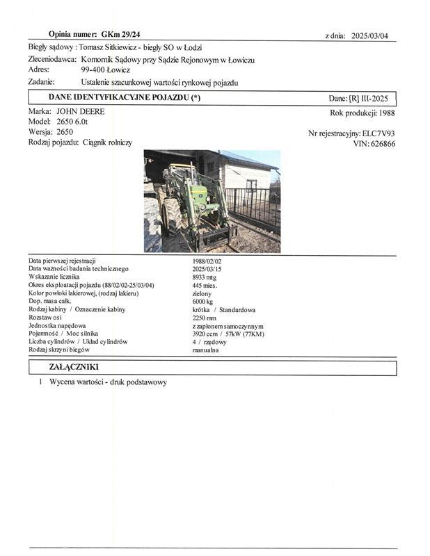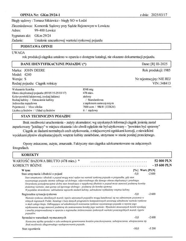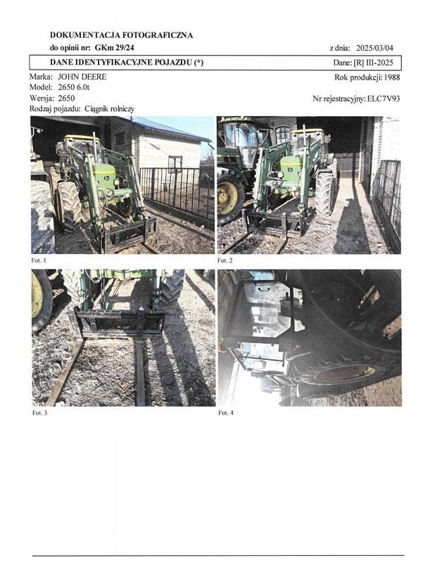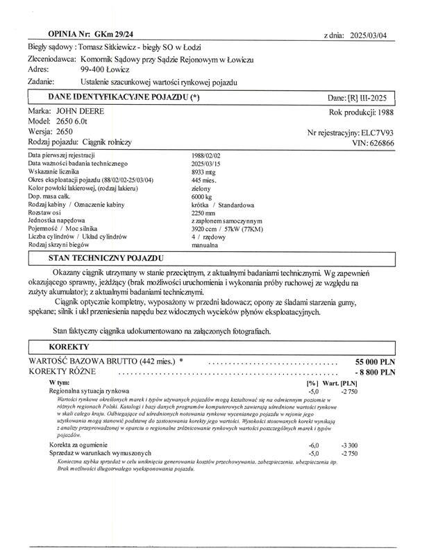 3 | CIĄGNIK ROLNICZY JOHN DEERE 2650 | 1 | 37 560,98 zł | 28 170,74 zł | 1 409,00 zł |