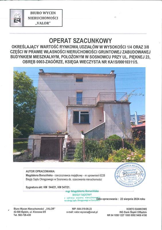 udział w wysokości 1/4 (udział nr 3) oraz 3/8 (udział nr 5) w prawie własności nieruchomości gruntowej zabudowanej budynkiem mieszkalnym, położonej w Sosnowcu przy ul. Piękna 23 i posiadającej księgę wieczystą nr: KA1S/00010311/5, którą prowadzi Sąd Rejonowy w Sosnowcu VI Wydział Ksiąg Wieczystych