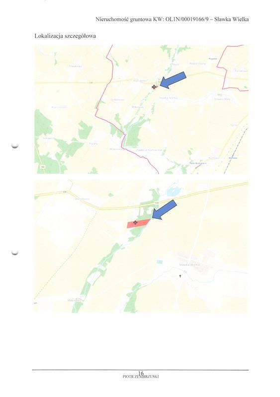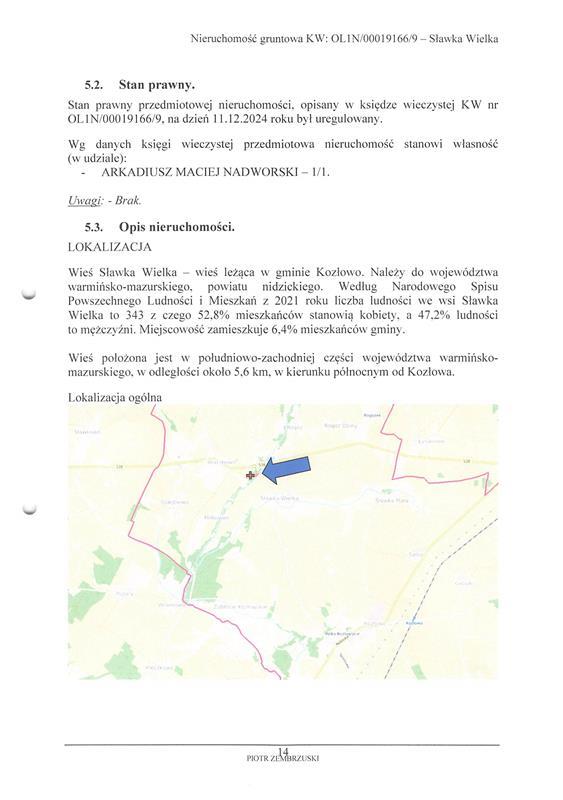 - nieruchomości położonej przy 0,Sławka Wielka, 13-124 Kozłowo, dla której Sąd Rejonowy w Nidzicy IV Wydział Ksiąg Wieczystych (adres: ul. ul. Kościuszki 15, Nidzica, 13-100 Nidzica) prowadzi księgę wieczystą o numerze OL1N/00019166/9.