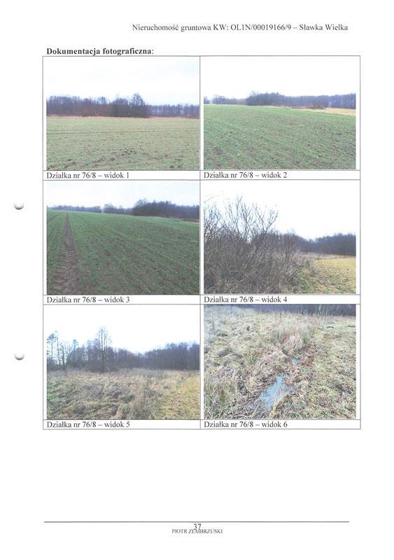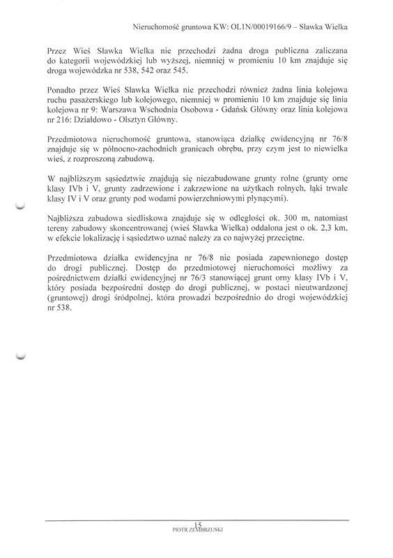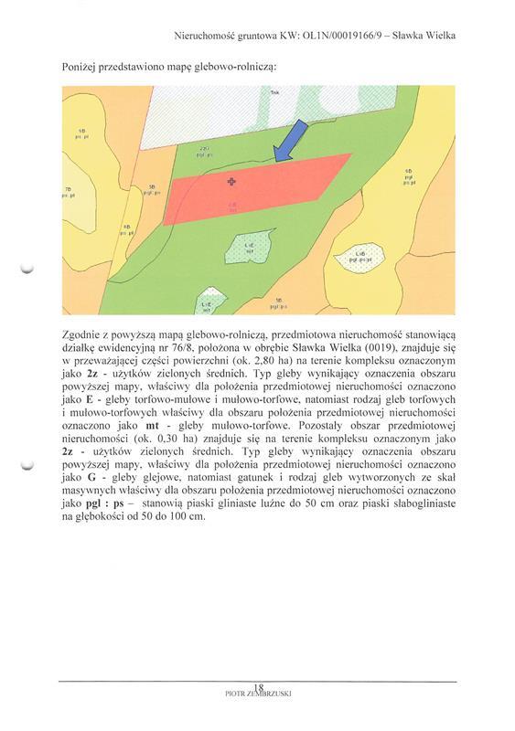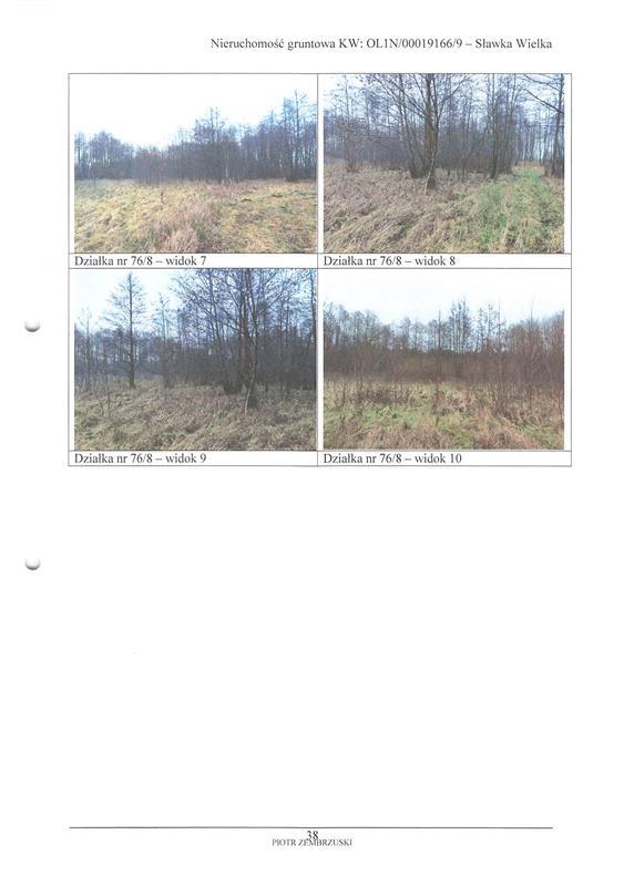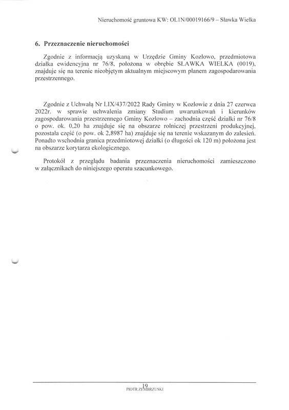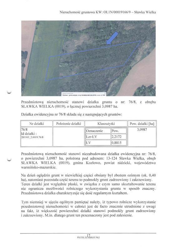prawo własności nieruchomości gruntowej stanowiącej działkę ewidencyjną nr 76/8 o powierzchni 3,0987 ha (grunty zadrzewione i zakrzewione na użytkach rolnych - Lzr-ŁV o pow. 2,2172 ha oraz łąki trwałe - ŁV o powierzchni 0,8815 ha) dla której Sąd Rejonowy w Nidzicy IV Wydział Ksiąg Wieczystych prowadzi księgę wieczystą o numerze OL1N/00019166/9. Nieruchomość jest położona w 13-124 Sławka Wielka, gmina Kozłowo, powiat nidzicki. W najbliższym sąsiedztwie nieruchomości znajdują się niezabudowane grunty rolne. Przedmiotowa działka 76/8 nie posiada zapewnionego dostępu do drogi publicznej. Dostęp do przedmiotowej nieruchomości możliwy za pośrednictwem działki ewidencyjnej nr 76/3. Na dzień oględzin nieruchomości tj. 11 grudnia 2024r. grunt w niewielkiej części obsiany był zbożem ozimym natomiast pozostała część terenu to podmokły grunt zadrzewiony i zakrzewiony. Teren działki jest względnie płaski. Przedmiotowa działka ewidencyjna nr 76/8 znajduje się na terenie nieobjętym aktualnym miejscowym planem zagospodarowania przestrzennego. Zgodnie ze studium uwarunkowań i kierunków zagospodarowania przestrzennego zachodnia część działki nr 76/8 o powierzchni około 0,20 ha znajduje się na obszarze rolniczej przestrzeni produkcyjnej, a pozostała część o powierzchni około 2,8987 ha znajduje się na terenie wskazanym do zalesień. Wschodnia granica przedmiotowej działki o długości około 120 m położona jest na obszarze korytarza ekologicznego. W dziale I Sp księgi wieczystej nieruchomości widnieje wpis uprawnienia o treści, iż każdoczesnemu właścicielowi nieruchomości przysługuje nieodpłatna i czasowo nieograniczona służebność gruntowa polegająca na prawie przechodu i przejazdu przez nieruchomość oznaczoną nr działki 76/8 pasmem szerokości 4m biegnącym od granicy nieruchomości władnącej wzdłuż zachodniej granicy nieruchomości obciążonej graniczącej z nieruchomością oznaczoną nr działki 76/3, a następnie pasmem gruntu biegnącym wzdłuż północnej granicy nieruchomoścu obciążonej z nieruchomością oznaczoną nr 76/3 do drogi publicznej.