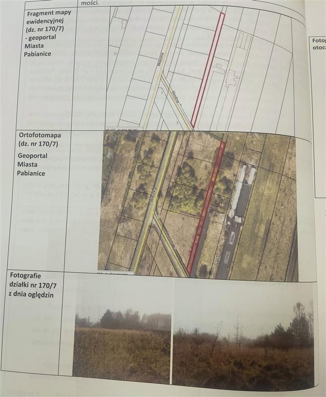 Przedmiotem licytacji jest 1/2 ułamkowa część działki nr 170/7 o pow. 0,0862 ha, jest nieogrodzona, nieutwardzona, porośniętą roślinnością; znajduje się na terenie jednostki urbanistycznej oznaczonej symbolem "KDW" - teren komunikacji - droga wewnętrzna.