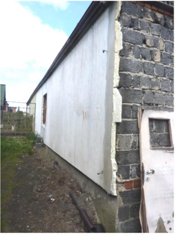 podpiwniczenia schodami z poziomu terenu, dostęp do pomieszczenia na parterze z sąsiedniej nieruchomości przez rozebrany fragment ściany działkowej w granicy nieruchomości. Budynek o znacznym zużyciu i zniszczeń poszczególnych elementów w szczególności wykończeniowych. Brak fragmentu ściany oddzielającej przedmiotową część od części budynku na sąsiedniej nieruchomości. Brak bramy wjazdowej i dostępu do kondygnacji parteru z terenu przedmiotowej nieruchomości.