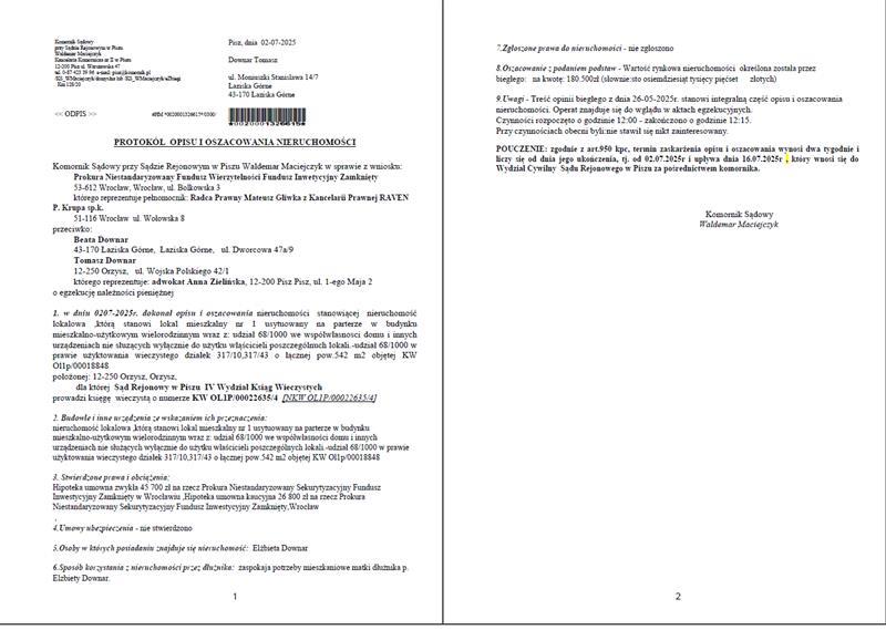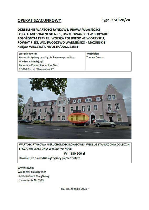 - nieruchomości położonej przy Wojska Polskiego 42/1, 12-250 Orzysz, dla której Sąd Rejonowy w Piszu IV Wydział Ksiąg Wieczystych (adres: ul. Warszawska 47, Pisz, 12-200 Pisz) prowadzi księgę wieczystą o numerze OL1P/00022635/4.