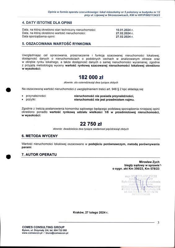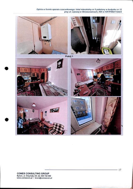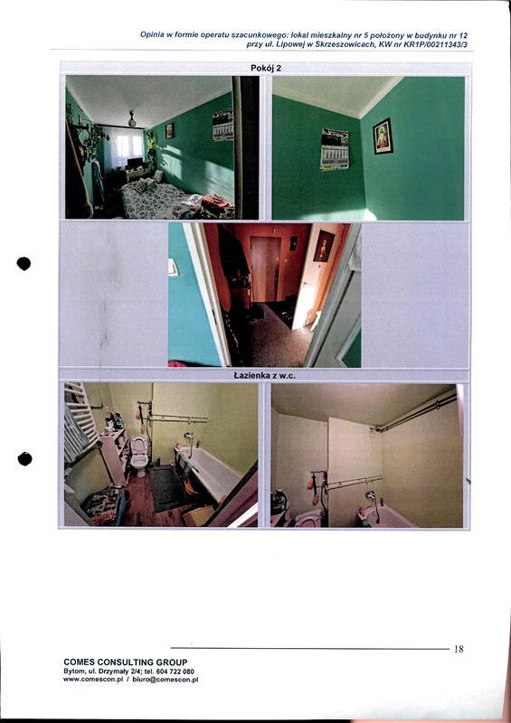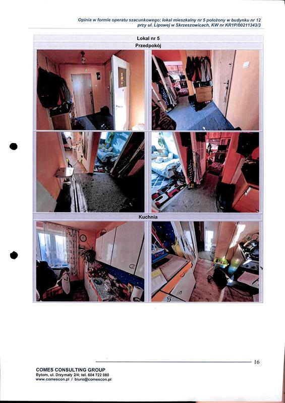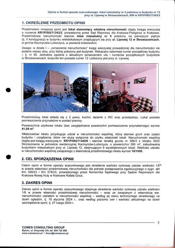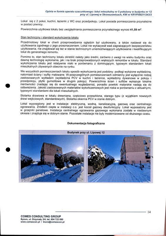 udział 1/8 w lokalu mieszkalnym stanowiącym odrębną nieruchomość. Mieszkanie położone jest Skrzeszowicach (gmina Kocmyrzów-Luborzyca), przy ul. Lipowej 12/5 stanowiące własność dłużnika Wójcik Sławomira. Lokal posiada założoną księgę wieczystą w Wydziale Ksiąg Wieczystych Sądu Rejonowego dla Krakowa Podgórza w Krakowie nr KR1P/00211343/3. Lokal położony jest na pierwszym piętrze, składa się z 2 pokoi, kuchni, łazienki z wc oraz przedpokoju. Posiada pomieszczenie przynależne w postaci piwnicy. Pow. użytkowa lokalu (bez piwnicy) wynosi 41,59 m2. Właścicielowi przysługuje udział w nieruchomości wspólnej w wys. 10/100, którą stanowi grunt oraz części budynku i urządzenia, które nie służą wyłącznie do użytku właścicieli lokali.