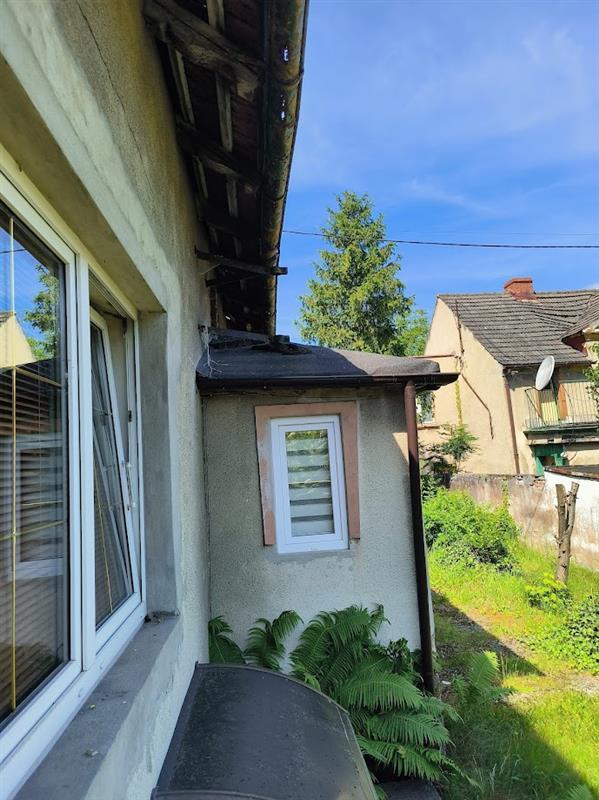 Udział 1/2 w nieruchomości w której skład wchodzą dwie działki gruntu oznaczone nr. ewidencyjnym 132//1 i 132/2. Działka 132/2 zabudowana jest budynkiem mieszkalnym w zabudowie wolnostojącej oraz dwoma budynkami gospodarczymi. Dostęp do drogi publicznej realizowany jest bezpośrednio poprzez ulicę Nowowiejską. Otoczenie nieruchomości stanowi zabudowa jednorodzinna oraz tereny niezabudowane. Działka ogrodzona jest w części płotem z siatki. Budynek mieszkalny na działce wybudowany w technologii murowanej, dach kryty dachówką cementową starą z ubytkami. Działka posiada przyłącz wodny oraz energetyczny. Rok budowy budynku 1945. Pow. użytkowa budynku wynosi 75 m2, na parterze znajdują się następujące pomieszczenia: kuchnia, komunikacja, wiatrołap, łazienka, dwa pokoje, pralnia. W pomieszczeniach są liczne ślady zalania z racji nieszczelnego pokrycia dachu. Ściany oraz sufity wykończone płytami gipsowymi. Posadzki z płytek. Okna pcv. Wnętrze domu wymaga poważnego remontu.