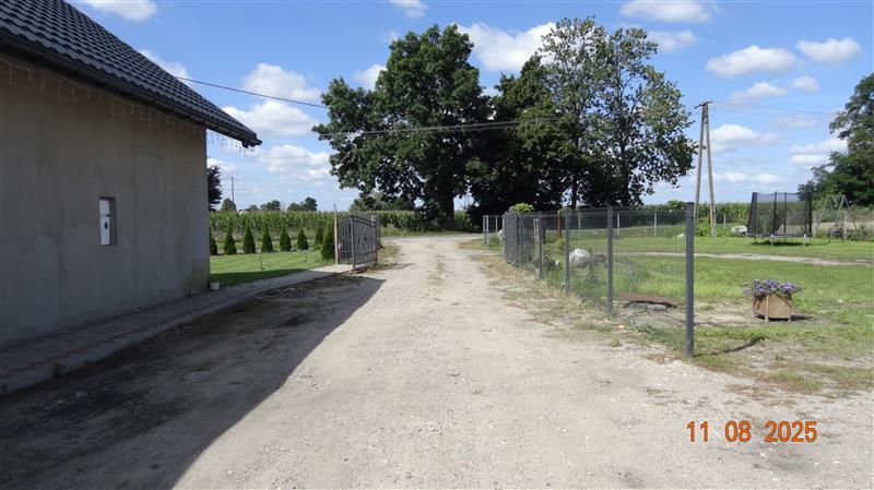 Działka nr ewid. 38/1 - o kształcie regularnym. Dojazd drogą publiczną utwardzoną masą bitumiczną. Działka zabudowana budynkiem mieszkalnym, kotłownią, stodołą z oborą, kompleksem budynków gospodarczych i garaży. Teren siedliska częściowo ogrodzony płotem betonowym oraz ogrodzeniem panelowym z bramą i furtką konstrukcji stalowej. Działka posiada przyłącze energetyczne oraz wodne. Odpływ nieczystości do własnego szamba. Na pozostałej części działki znajduje się warzywniak i mały tunel foliowy.