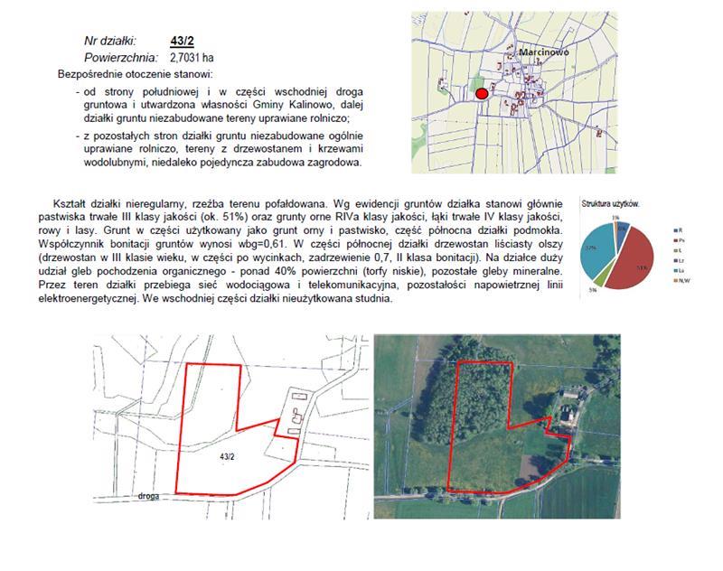 Przedmiotem licytacji jest nieruchomość gruntowa położona w woj. warmińsko-mazurskim, powiecie ełckim, jednostce ewidencyjnej Kalinowo, obrębie Marcinowo w zakresie prawa własności niezabudowanej działki gruntu nr 43/2 o pow. 2,7031ha, dla której Sąd Rejonowy w Ełku prowadzi księgę wieczystą nr KW OL1E/00001872/3. Działka gruntu obciążona prawem użytkowania.