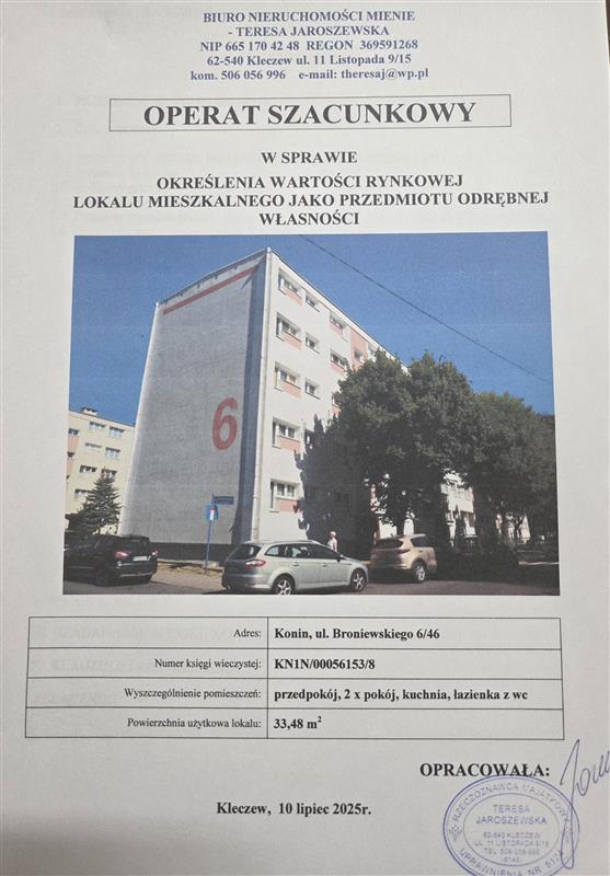 - lokalu mieszkalnego położonego przy Broniewskiego 6/46, 62-510 Konin, dla którego Sąd Rejonowy w Koninie VI Wydział Ksiąg Wieczystych (adres: ul. ul. Chopina 28, Konin, 62-510 Konin) prowadzi księgę wieczystą o numerze KN1N/00056153/8.