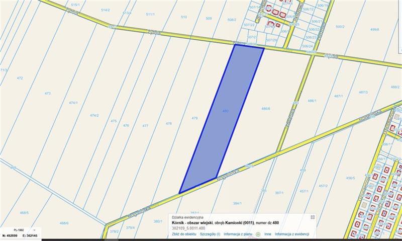 udział 1/4 w działce nr 480 położonej między ul. Żytnią i ul. Rogalińską w Kamionkach o pow. 31 597m (2) z przeznaczeniem w części pod zabudowe mieszkaniową w części tereny rolnicze lub zieleń nieurządzoną. Działka z dostępem do drogi publicznej (ul. Żytnia i ul Rogalińska) Media w ulicy - gaz, prąd, woda.