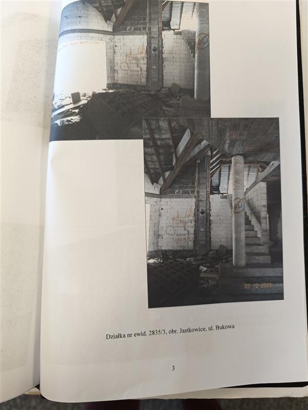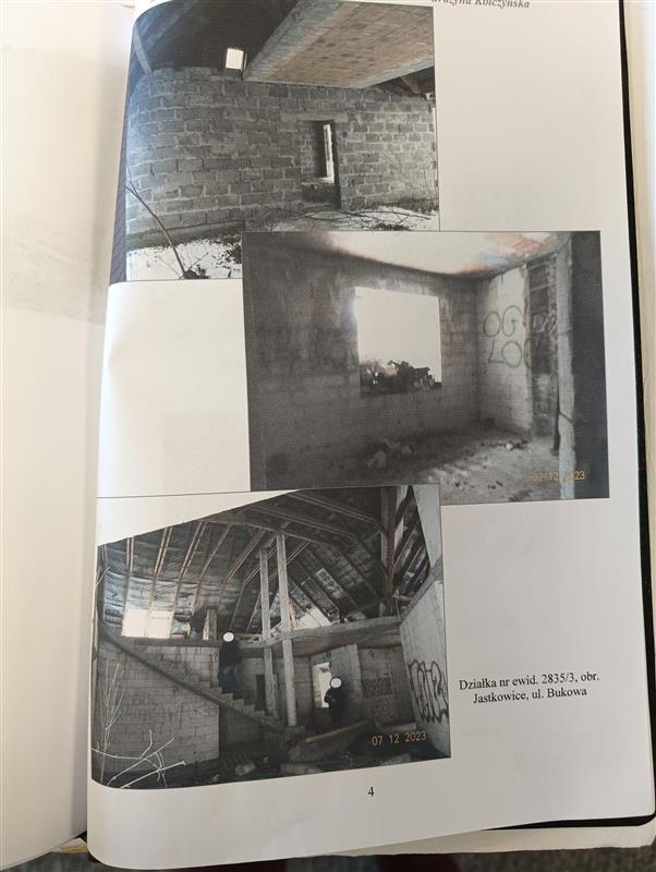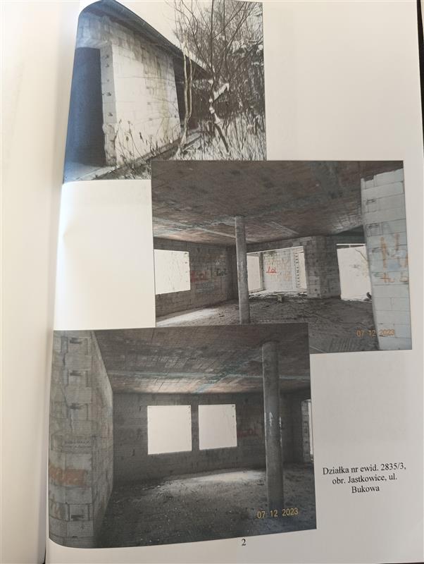 Działka gruntu o nr ewid. 2835/3, obr. Jastkowice o powierzchni 0,23 ha położona we wsi Jastkowice przy ul. Bukowej, w sąsiedztwie zabudowy jednorodzinnej, zabudowana murowanym budynkiem mieszkalnym, parterowym z poddaszem użytkowym, niepodpiwniczonym – z garażem w przewiązce, przekrytym dachem wielospadowym krytym dachówką, w stanie surowym otwartym, budowa rozpoczęta na podstawie pozwolenia na budowę z 1999 r. Budynek o pow. zabudowy 412 m2, pow. użytkowej ok. 254 m2, bud. gospodarczo – garaż. p.z. 54 m2, p.u. 40 m2