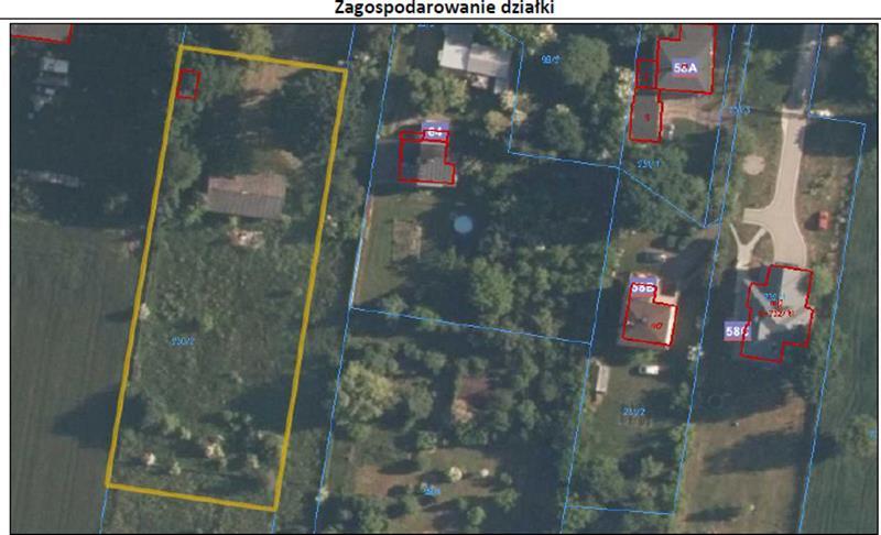 Działka w części ogrodzona, nieuzbrojona, zabudowana wolnostojącym budynkiem gospodarczym o powierzchni zabudowy 121 m2. Budynek jednokondygnacyjny ,murowany. Dostęp do działki z drogi wewnętrznej - działki nr 230/8. Działka stanowi użytki: RIVb i RV. Zgodnie ze studium: tereny zabudowy mieszkaniowej jednorodzinnej, rekreacji indywidualnej i usługowej.