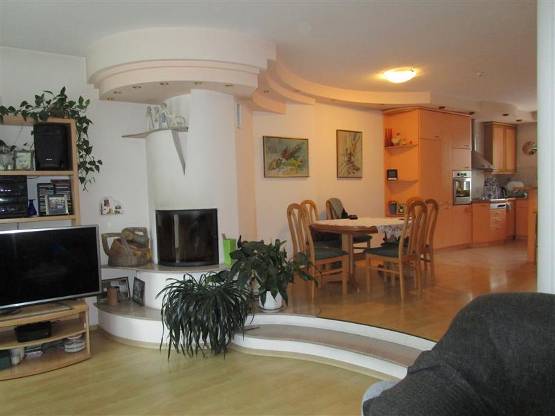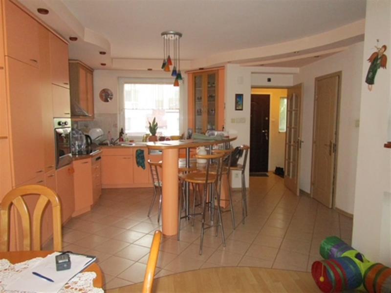 W budynku mieszkalnym na parterze znajduje się salon z jadalnią i kuchnią, łazienka, klatka schowa, wiatrołap. Na pierwszym piętrze zlokalizowane są trzy pokoje, łazienka, korytarz i klatka schodowa. Na poddaszu jest pokój i schowek. W piwnicy jest garaż, kotłownia, pralnia, wc, pomieszczenia gospodarcze, komunikacja. W salonie i jadalni na podłodze są panele, a w kuchni i wiatrołapie płytki terakoty. W salonie jest kominek. W kuchni zabudowa jest wykonana na wymiar. W łazience posadzka wyłożona jest terakotą, ściany są obłożone glazurą. Na piętrze w pokojach i korytarzu podłogi są wyłożone panelami. Ściany w pokojach są malowane lub obłożone tapetami. W korytarzu ściany są obłożne boazerią. Drzwi wewnętrzne na piętrze drewniane. Schody wewnętrzne obłożone drewnem, barierki drewniane. W łazience posadzka wyłożona jest terakotą, ściany są obłożone płytkami glazury. Wyposażenie łazienki stanowią: narożna wanna z hydromasażem, umywalka, sedes. W pokoju na poddaszu podłoga jest z desek, ściany i skosy obłożone są boazerią. Okna są pcv. Grzejniki płytowe. W piwnicy posadzki są wyłożone płytkami gresu (poza pomieszczeniem pod tarasem i jednym pomieszczeniem gospodarczym). W wc, pralni, kotłowni ściany obłożone płytkami glazury. Brama garażowa segmentowa. Taras wyłożony płytkami gresu – do naprawy. Budynek wyposażony w instalacje wodociągową, kanalizacyjną, elektryczną, gazową, grzewczą – ogrzewanie etażowe gazowe, alarmową (według oświadczenia niesprawną). Elementy wykończeniowe przeciętnej jakości i dobrej jakości z oznakami użytkowania.
