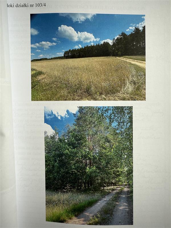 Grunt Niezabudowany, działka nr 103/4 - lasy, grunty orne, o powierzchni - 5,3187ha. Teren płaski, częściowo uprawiany, częściowo zalesiony, kształt prostokąta. Grunt ma dostęp do drogi publicznej nr 12032C o nawierzchni szutrowej. Teren uzbrojony w media infrastruktury technicznej: energii elektrycznej, wodociągowej, telefonicznej. Na działce brak przyłączy. W bezpośrednim sąsiedztwie są pola uprawne i lasy. Zgodnie ze studium uwarunkowań i kierunków zagospodarowania przestrzennego zatwierdzonego Uchwałą nr XXV/188/21 Rady Gminy Rypin z dnia 23 marca 2021r. działka nr 103/4 położona w strefie ekologicznej, w obszarze gleb średniej i niskiej przydatności rolniczej, częściowo lasy.