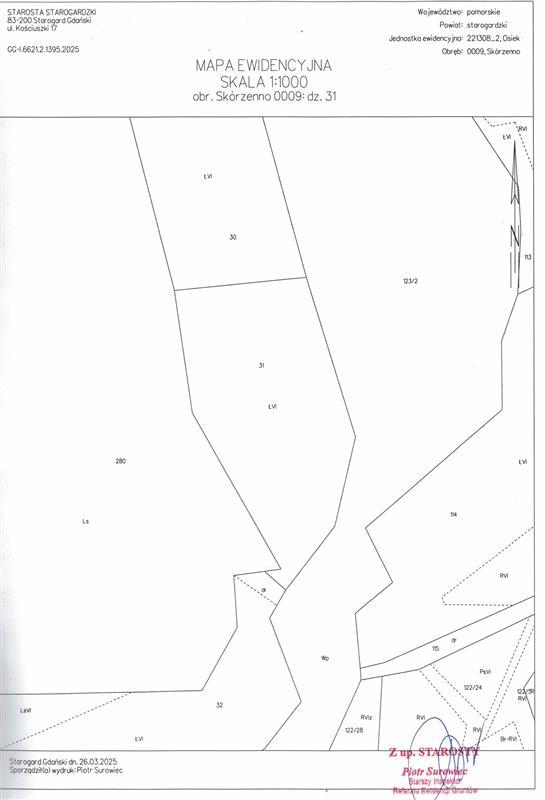 - ułamkowej części nieruchomości położonej przy dz. nr 31, 83-221 Skórzenno, dla której Sąd Rejonowy w Starogardzie Gdańskim V Wydział Ksiąg Wieczystych (adres: ul. Kościuszki 30, Starogard Gdański, 83-200 Starogard Gdański) prowadzi księgę wieczystą o numerze GD1A/00058112/6.
