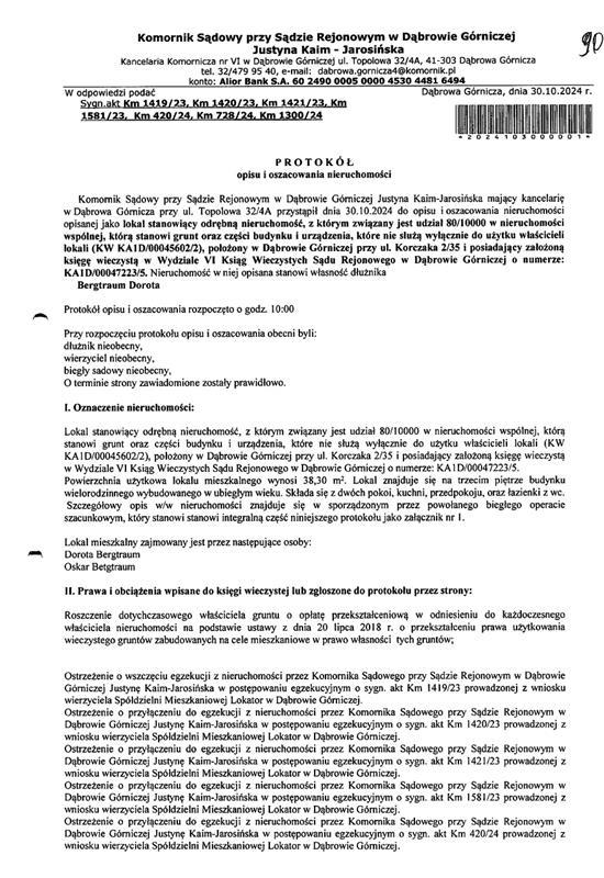- lokalu mieszkalnego położonego przy Korczaka 2/35, 41-300 Dąbrowa Górnicza, dla którego Wydział VI Ksiąg Wieczystych Sądu Rejonowego w Dąbrowie Górniczej (adres: ul. Korczaka 2/35, Dąbrowa Górnicza, 41-300 Dąbrowa Górnicza) prowadzi księgę wieczystą o numerze KA1D/00047223/5.