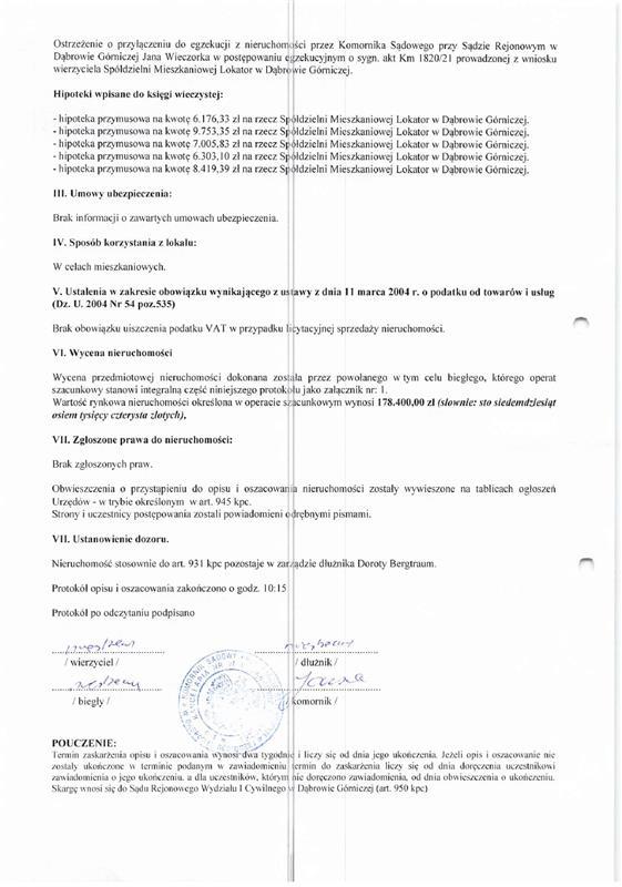 W ciągu dwóch tygodni przed licytacją wolno oglądać wyżej wymienioną nieruchomość w dni powszednie od godz. 10:00 do godz. 11:00. W systemie teleinformatycznym udostępnia się natomiast protokół opisu i oszacowania.