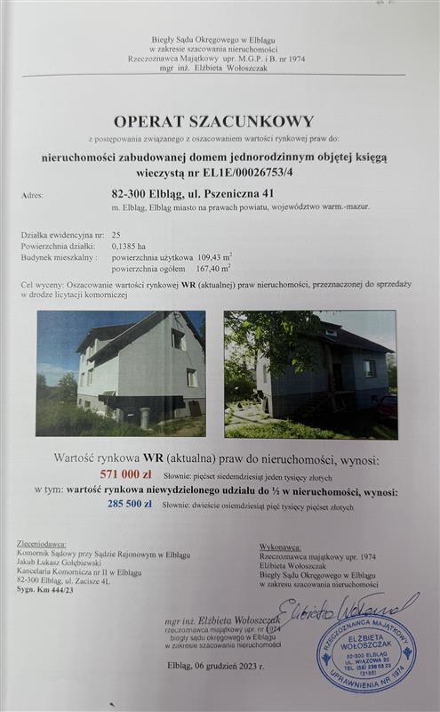 - ułamkowej części nieruchomości położonej przy ul. Pszeniczna 41, 82-300 Elbląg, dla której Sąd Rejonowy w Elblągu VI Wydział Ksiąg Wieczystych (adres: ul. Płk. Dąbka 21, Elbląg, 82-300 Elbląg) prowadzi księgę wieczystą o numerze EL1E/00026753/4.